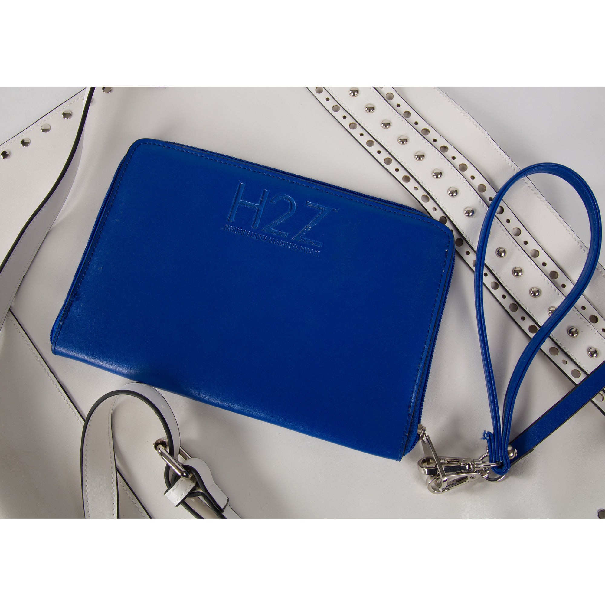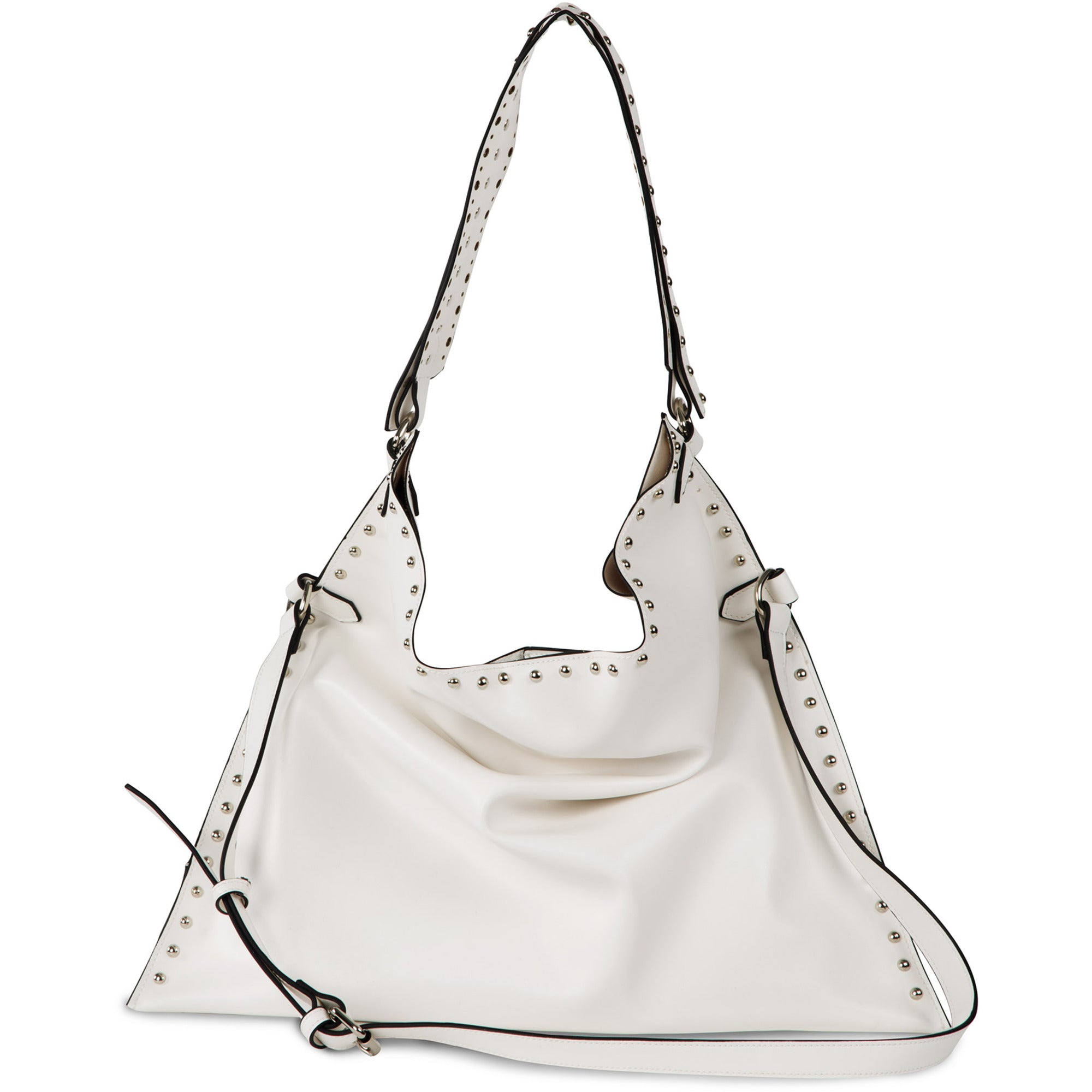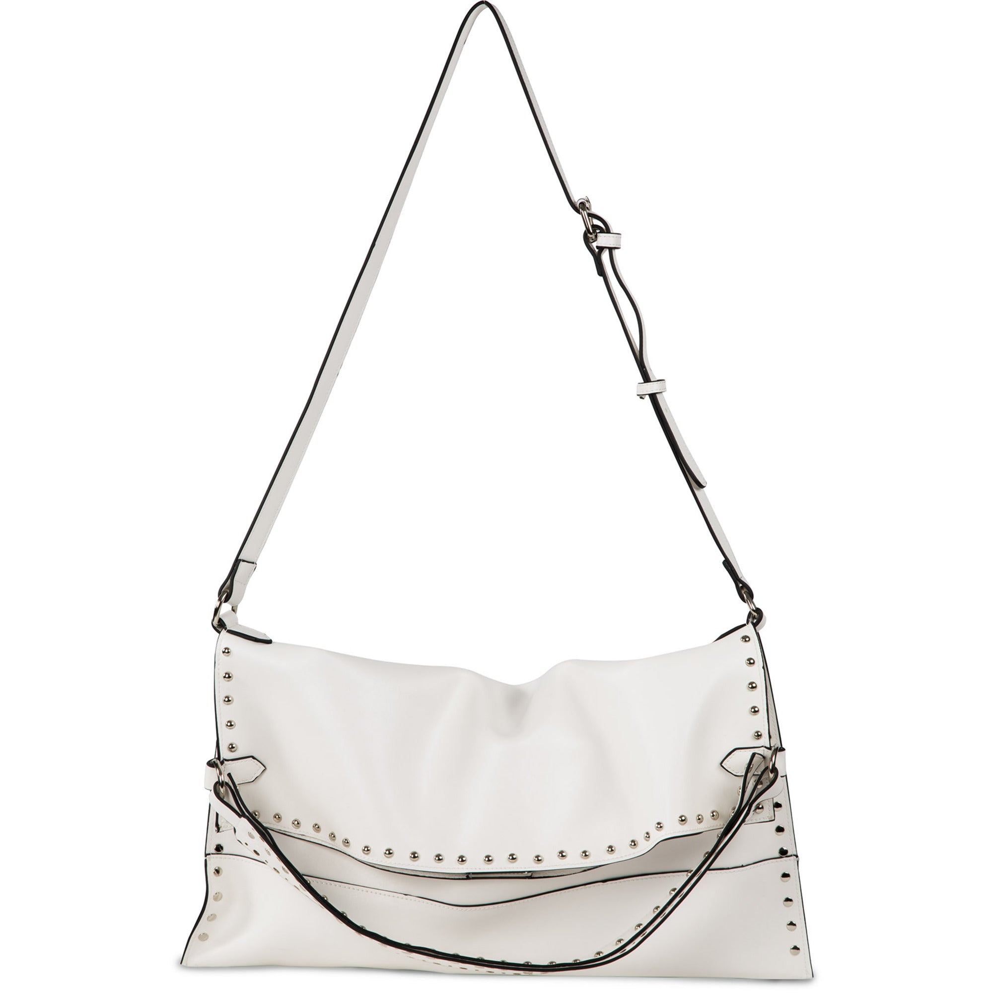 - IN-HOUSE DESIGN: Metal studs surround the exterior rim of the bag. Interior features three pockets: two open and one zippered.