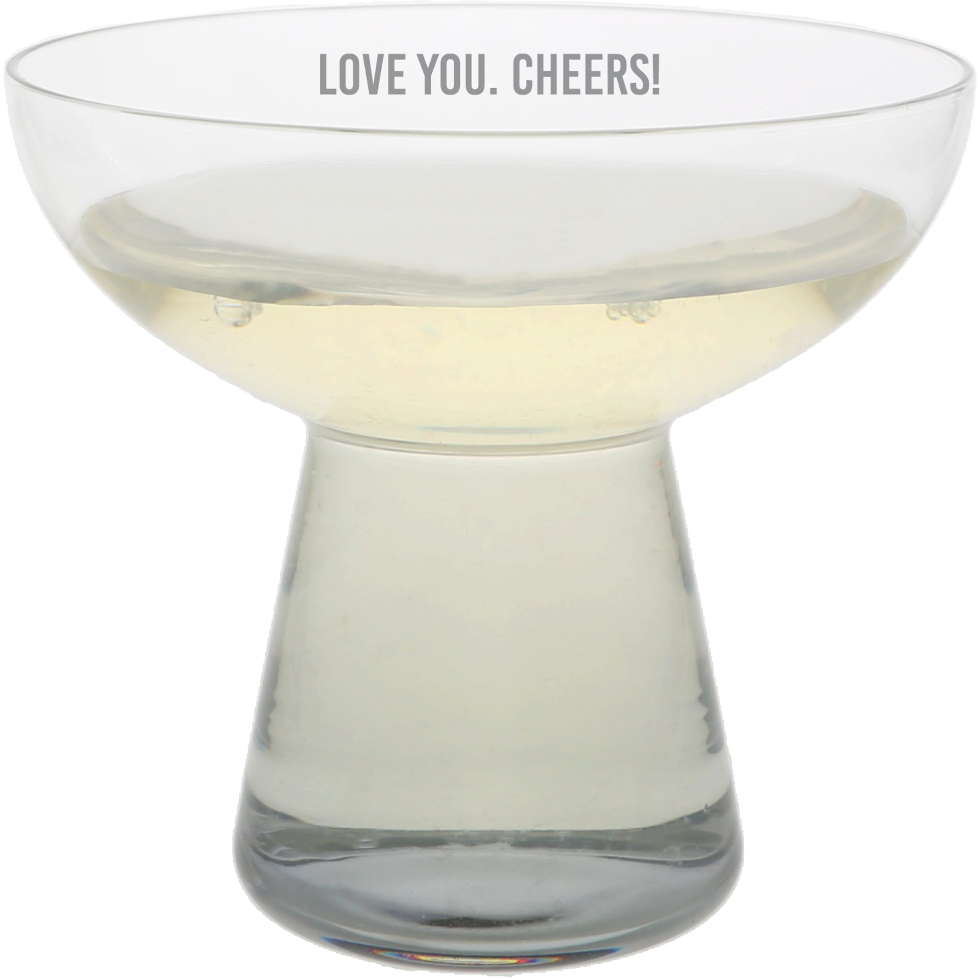 - IN-HOUSE DESIGN: The glass is clear at the top and becomes see-through gray through an ombre fade at the bottom. The sentiment "Love You, Cheers!" is printed on the exterior edge of the back of the brim.