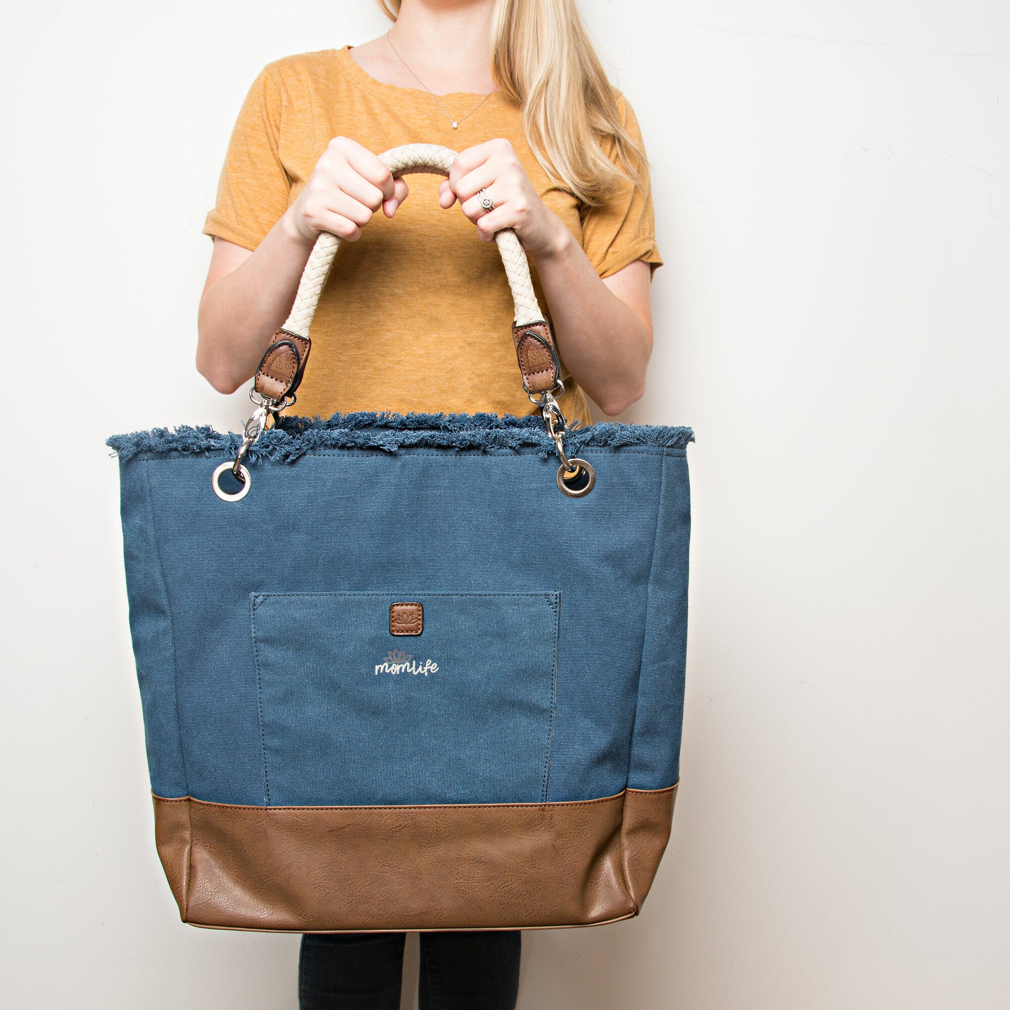 - IN-HOUSE DESIGN: "Mom Life" text and lotus flower icon are both sewn into the front of the bag.