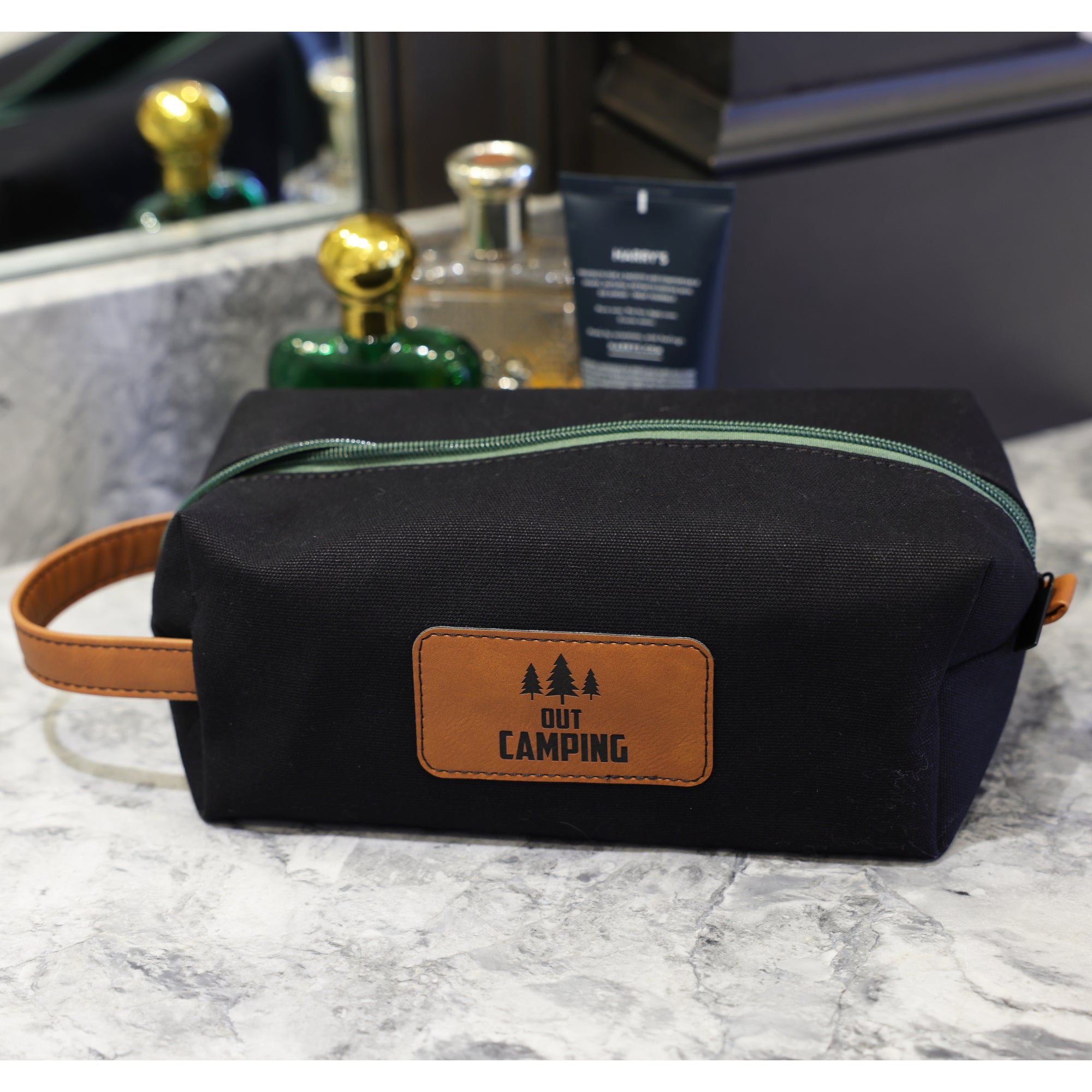 - IN-HOUSE DESIGN: The front side has a PU leather stitched rounded edge patch with debossed pine trees alongside "Out Camping" text. This pack is excellent for carrying flashlights, hand warmers, hats, gloves, and more. In addition, small shampoo bottles, body wash, conditioner, lotions, razors, toothbrushes, hair brushes/combs, and more will fit.