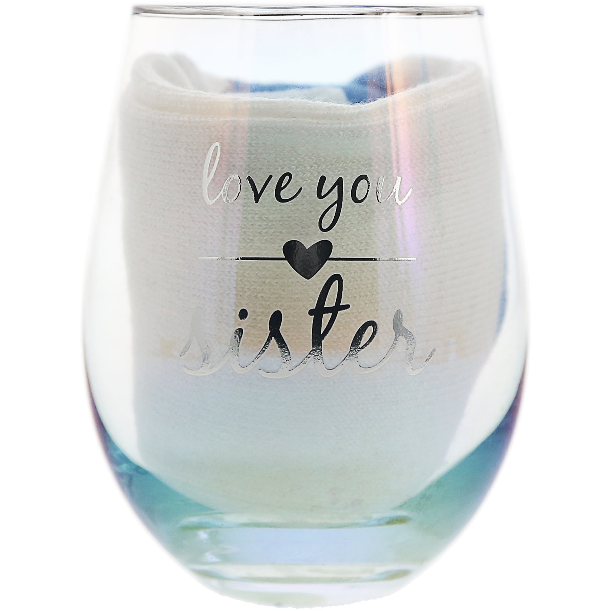 - IN-HOUSE DESIGN: The wine glass has an iridescent blue finish, an electroplated lip, and a “Love You Sister” sentiment with a line/heart underneath. The socks have a blue ankle, toe & heel with a cream body and a gray “Love You Sister” sentiment on the outer upper of the crew boot socks.
