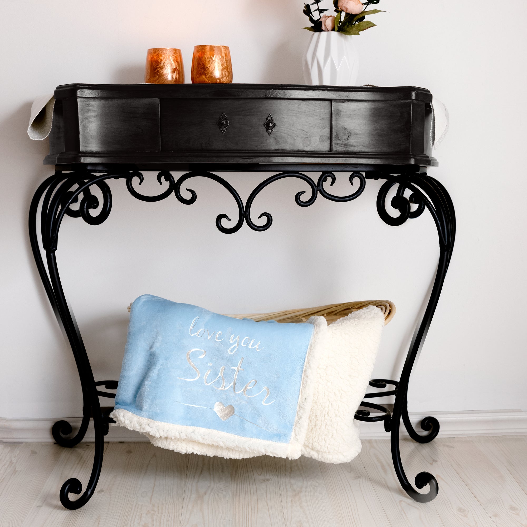 - IN-HOUSE DESIGN: The double-sided blanket has a debossed white embroidered "love you sister" sentiment matched by a heart pattern on the blue plush side of the blanket. The aromatherapeutic candle has a white "love you sister" sentiment and heart design. Socks have a gray ankle, heel, and toe accompanied by a heart and swirl design on a white sock base.
