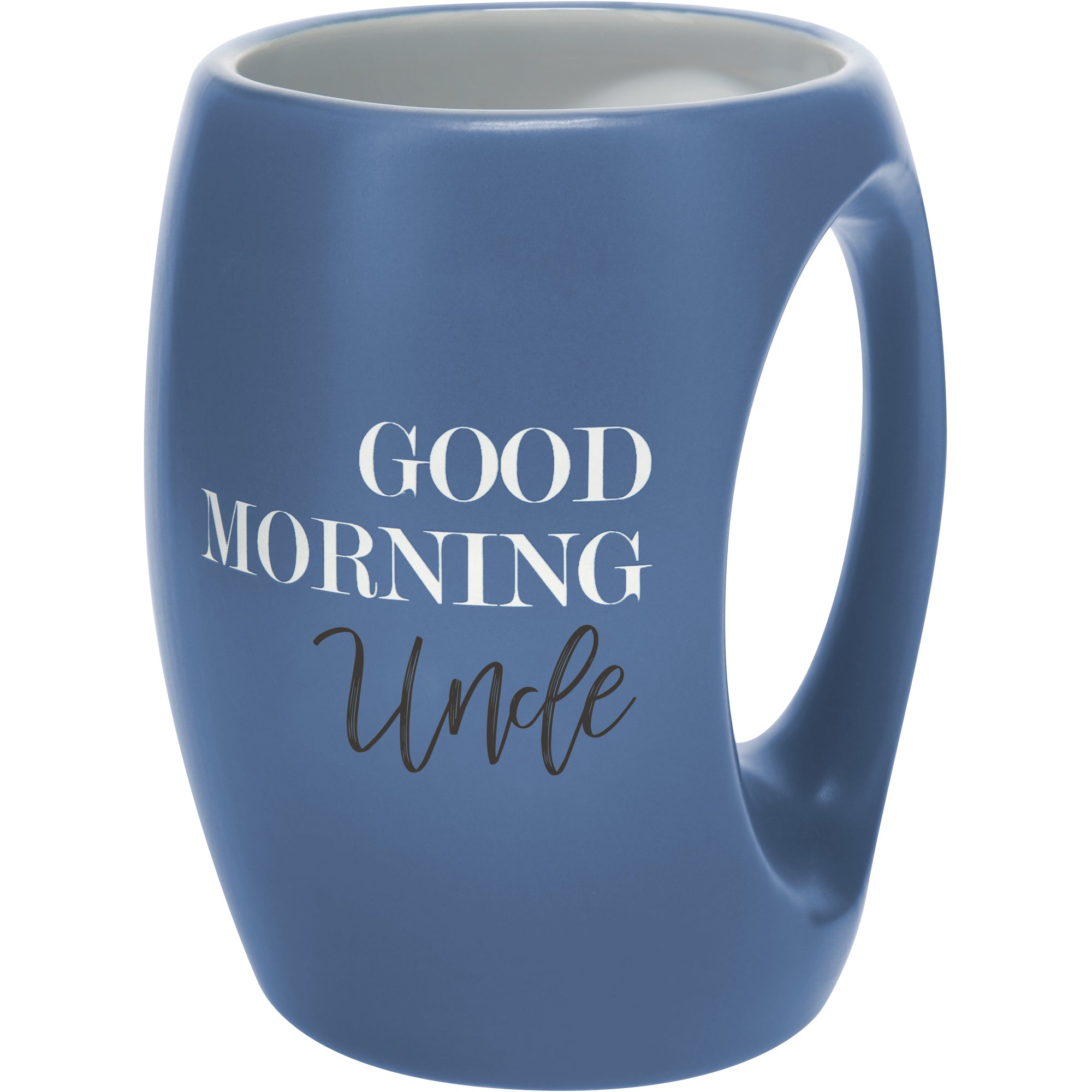 • IN-HOUSE DESIGN: "Good Morning Uncle" white and black sentiment decal on the front side of the matte blue cup. The Interior is white and has a glossy glaze prop 65 food-safe finish. We designed and created this mug to blend in with any of your kitchen's current drinkware collections with a refined, modern, and aesthetically pleasing look paired with humor and relatable sentiment.