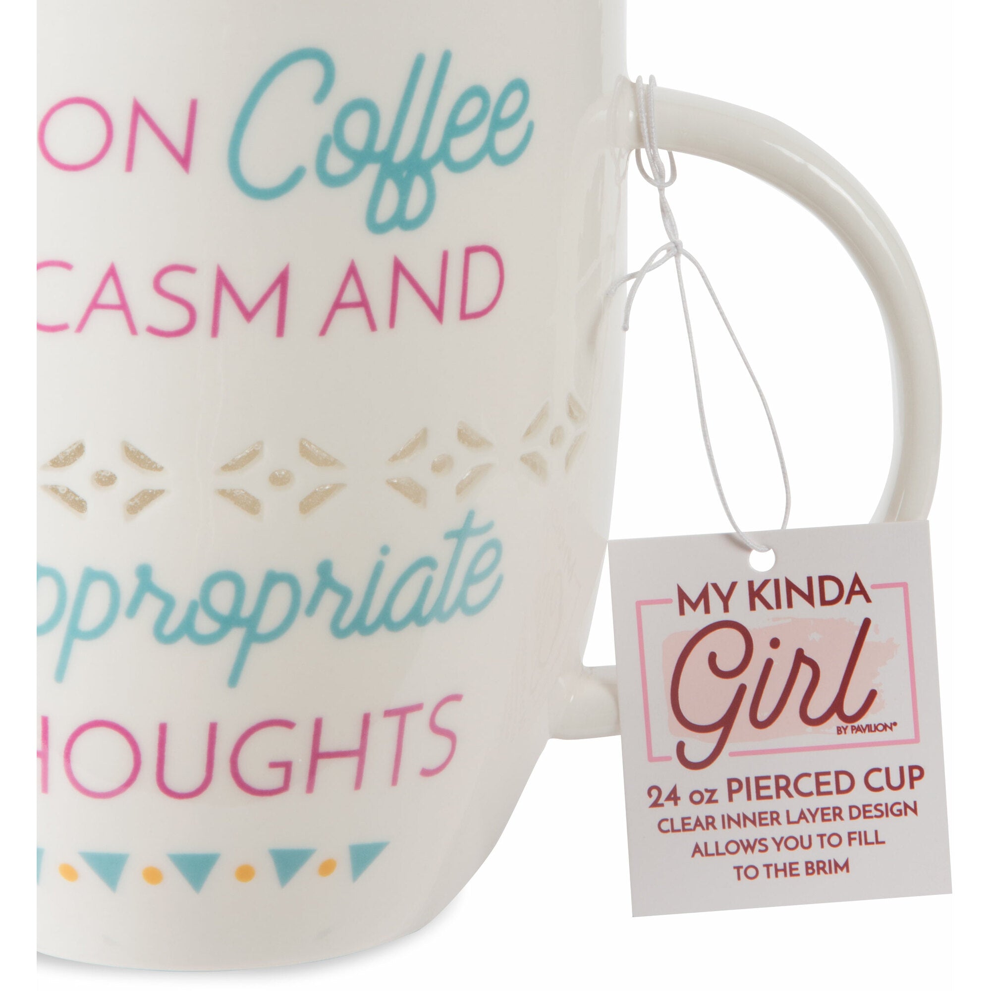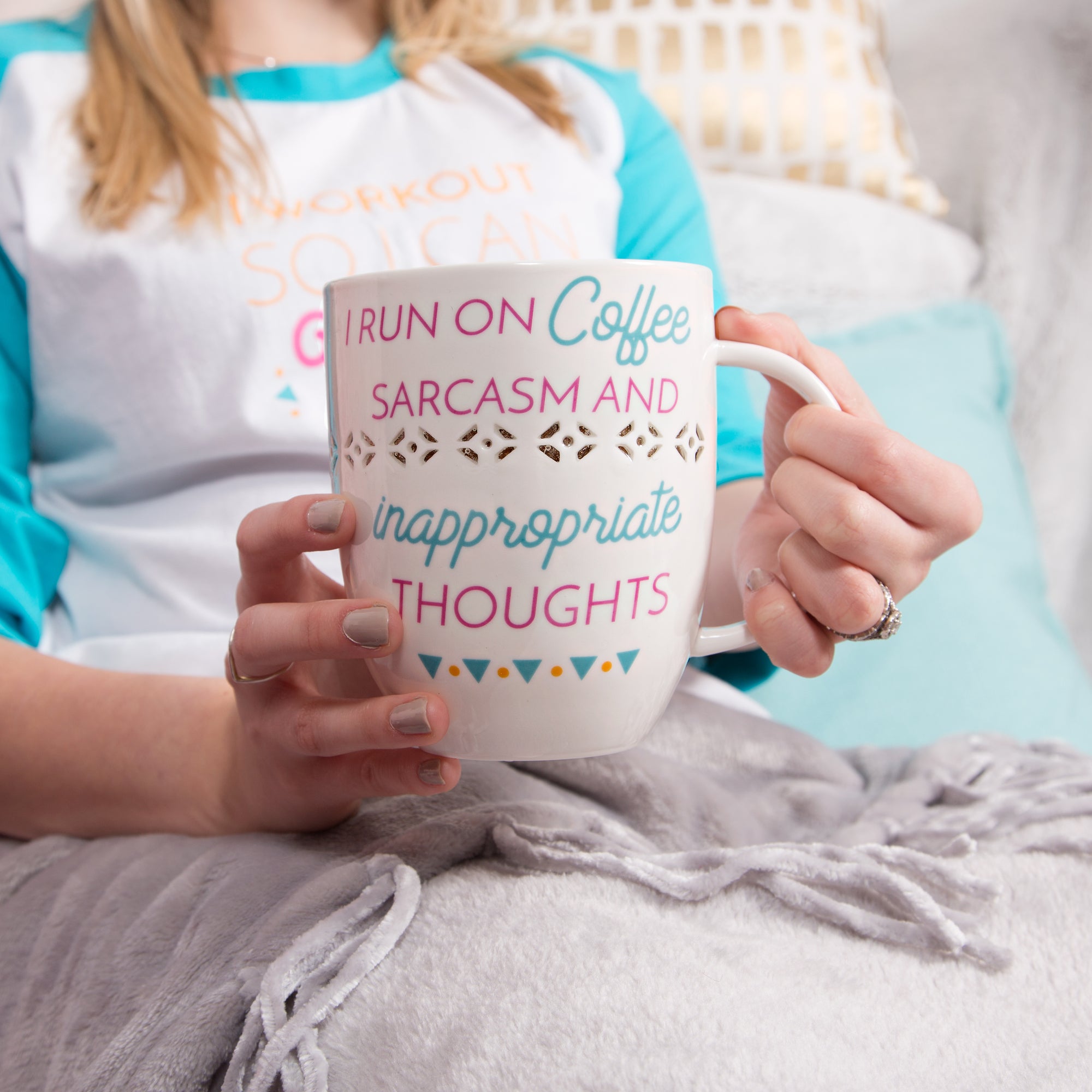 - IN-HOUSE DESIGN: "I Run On Coffee, Sarcasm And Inappropriate Thoughts" text is printed onto the mug, alongside a filled cut-out design that allows liquid to be poured into the entire mug.