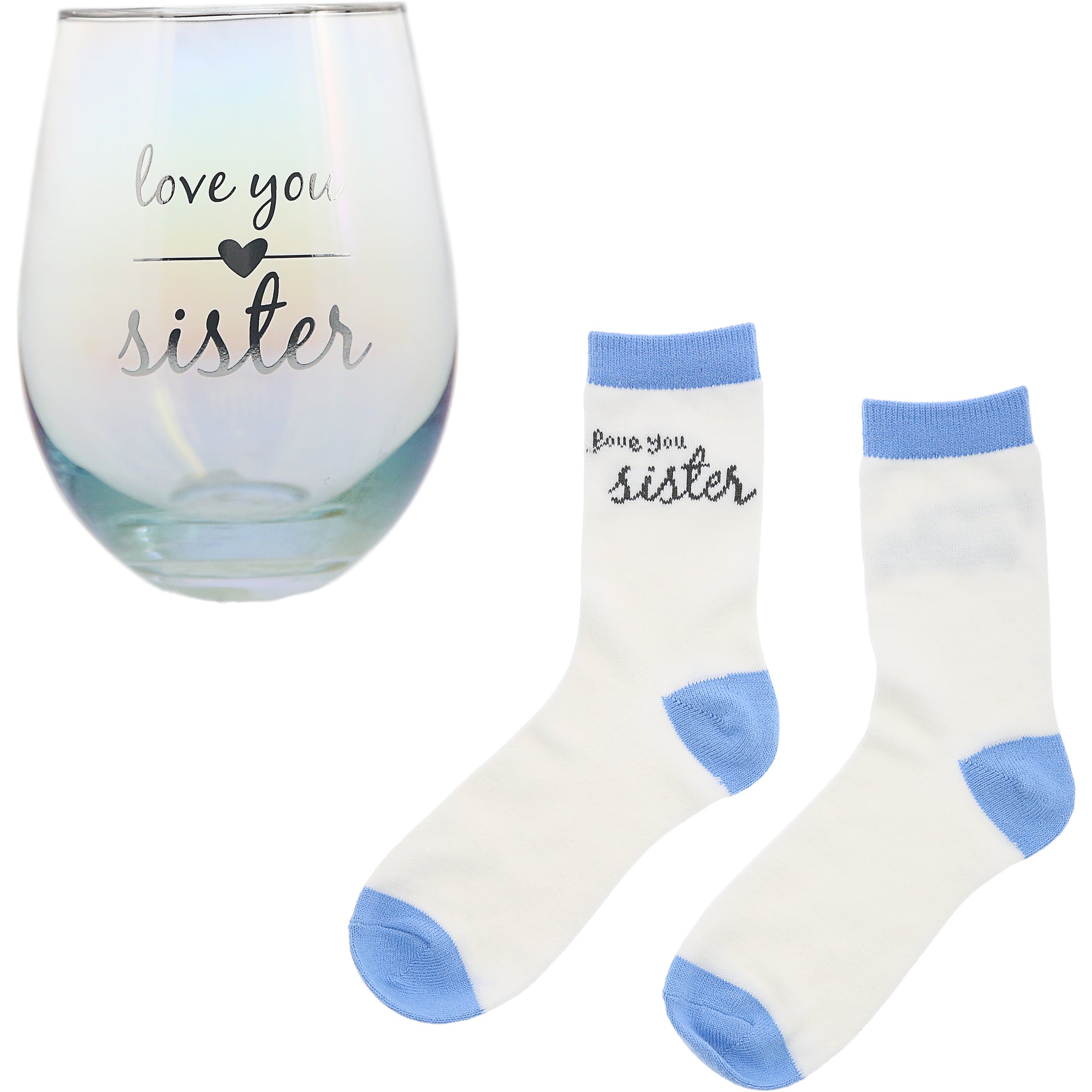 - IN-HOUSE DESIGN: The wine glass has an iridescent blue finish, an electroplated lip, and a “Love You Sister” sentiment with a line/heart underneath. The socks have a blue ankle, toe & heel with a cream body and a gray “Love You Sister” sentiment on the outer upper of the crew boot socks.