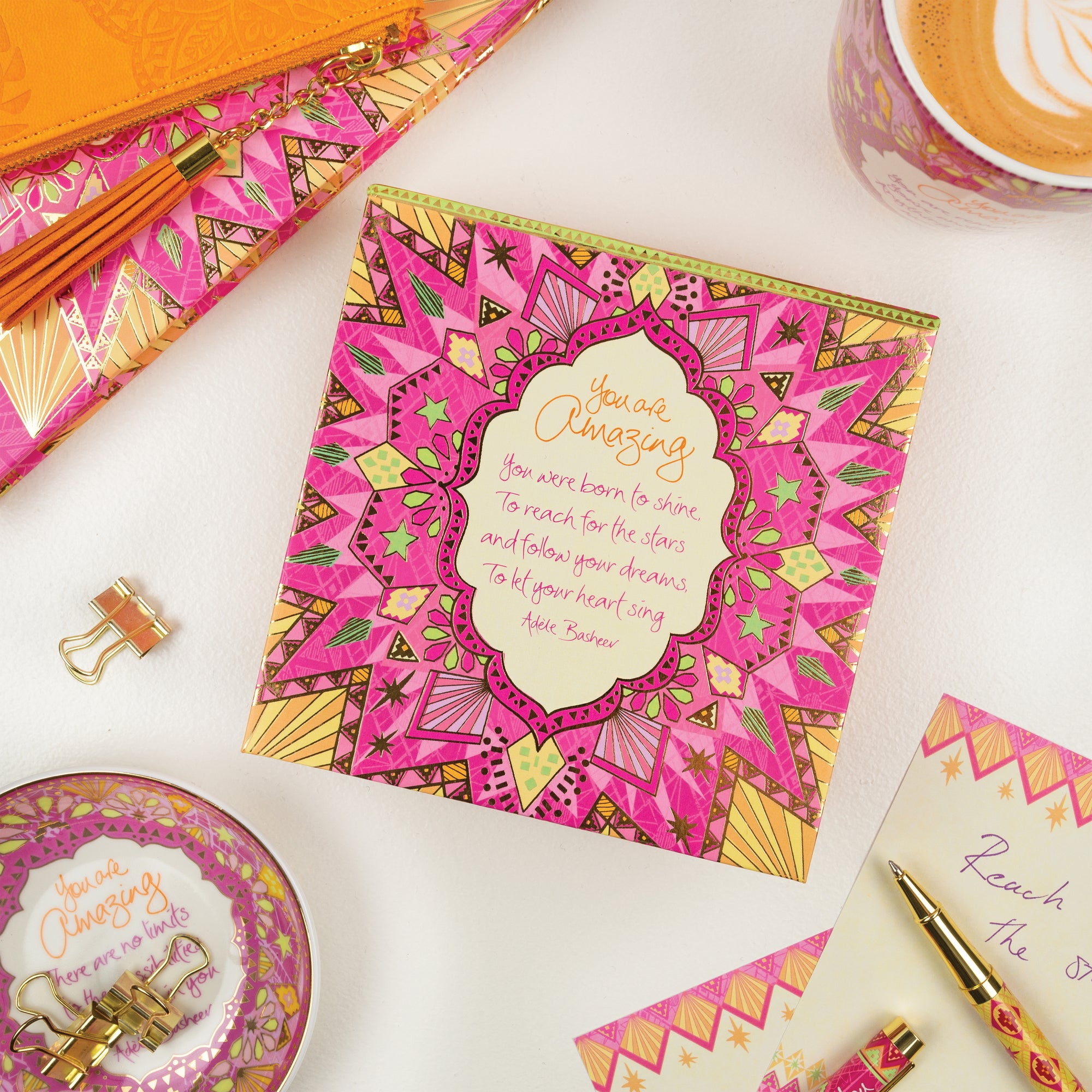 - IN-HOUSE DESIGN: Designed by Adele Basheer, "You Are Amazing; You Were Born To Shine; To Reach For The Stars And Follow Your Dreams; To Let Your Heart Sing" text and accompanying design are both printed onto the note box.