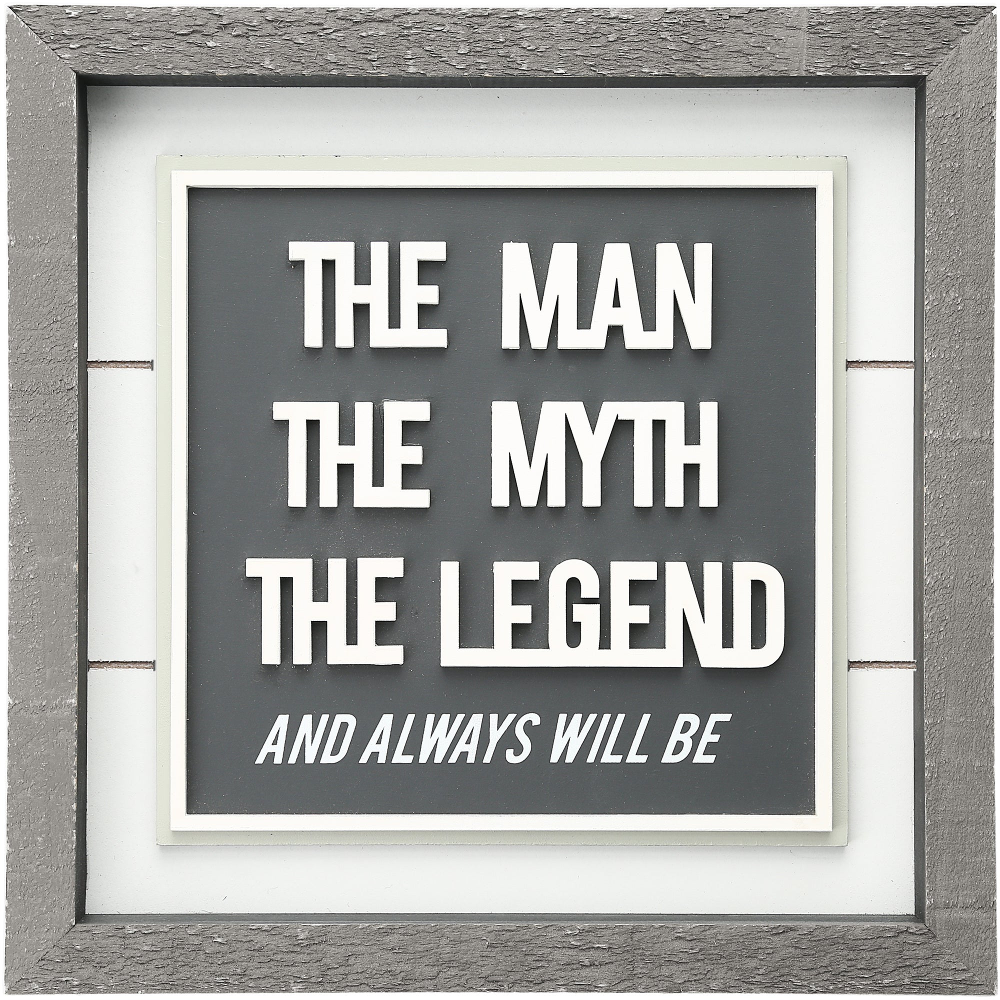 - IN-HOUSE DESIGN: Whitewashed gray pine rustic-style edges accompany a white shiplap backdrop, a raised dark gray box, and white edging. “The May The Myth The Legend” sentiment is 3-D, whereas the “And Always Will Be” text is printed onto the raised gray center.
