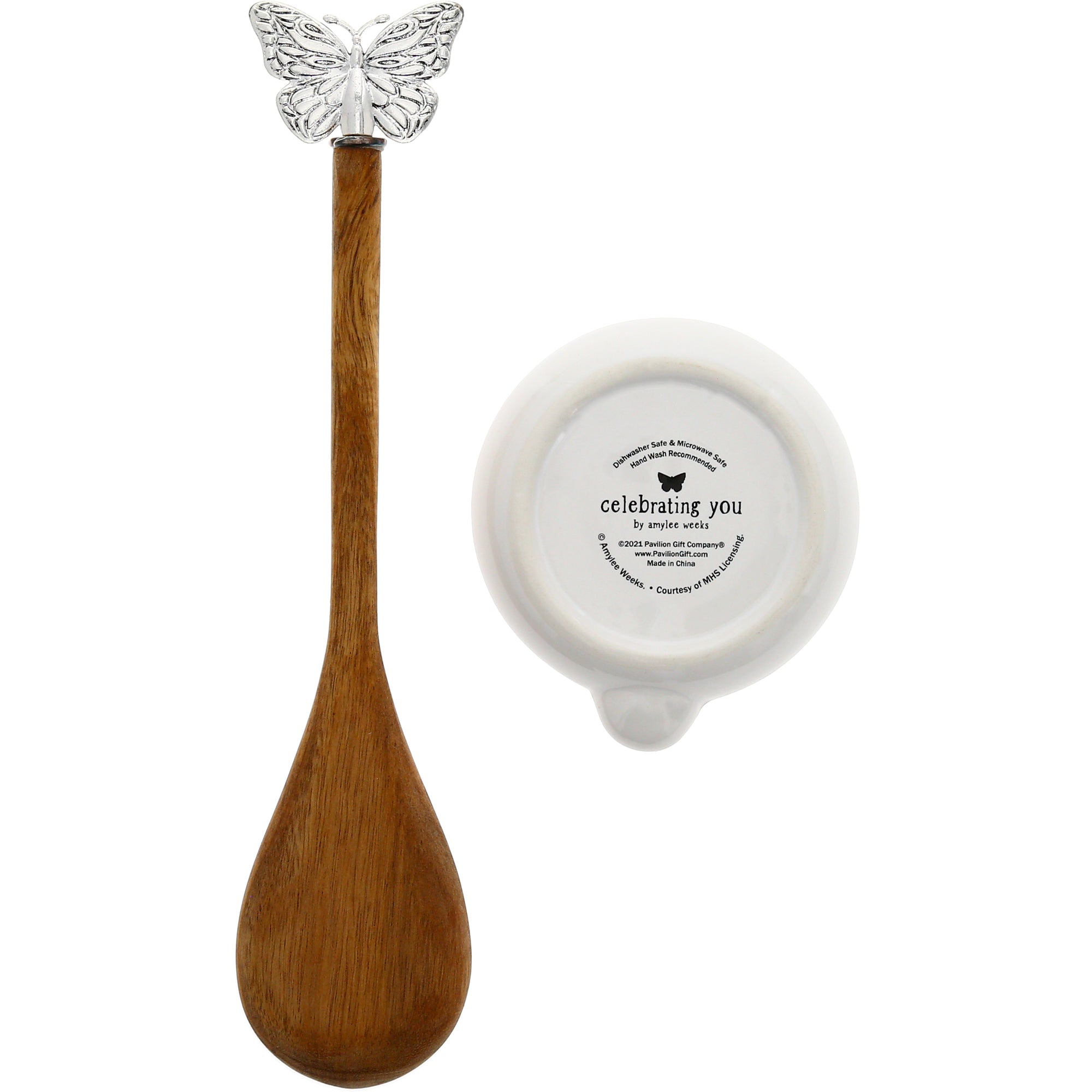 • IN-HOUSE DESIGN: "The secret ingredient is a mother's love" text and the accompanying butterfly decal and stripe pattern are applied to the top of the spoon rest. The zinc alloy butterfly is affixed to the wooden spoon.