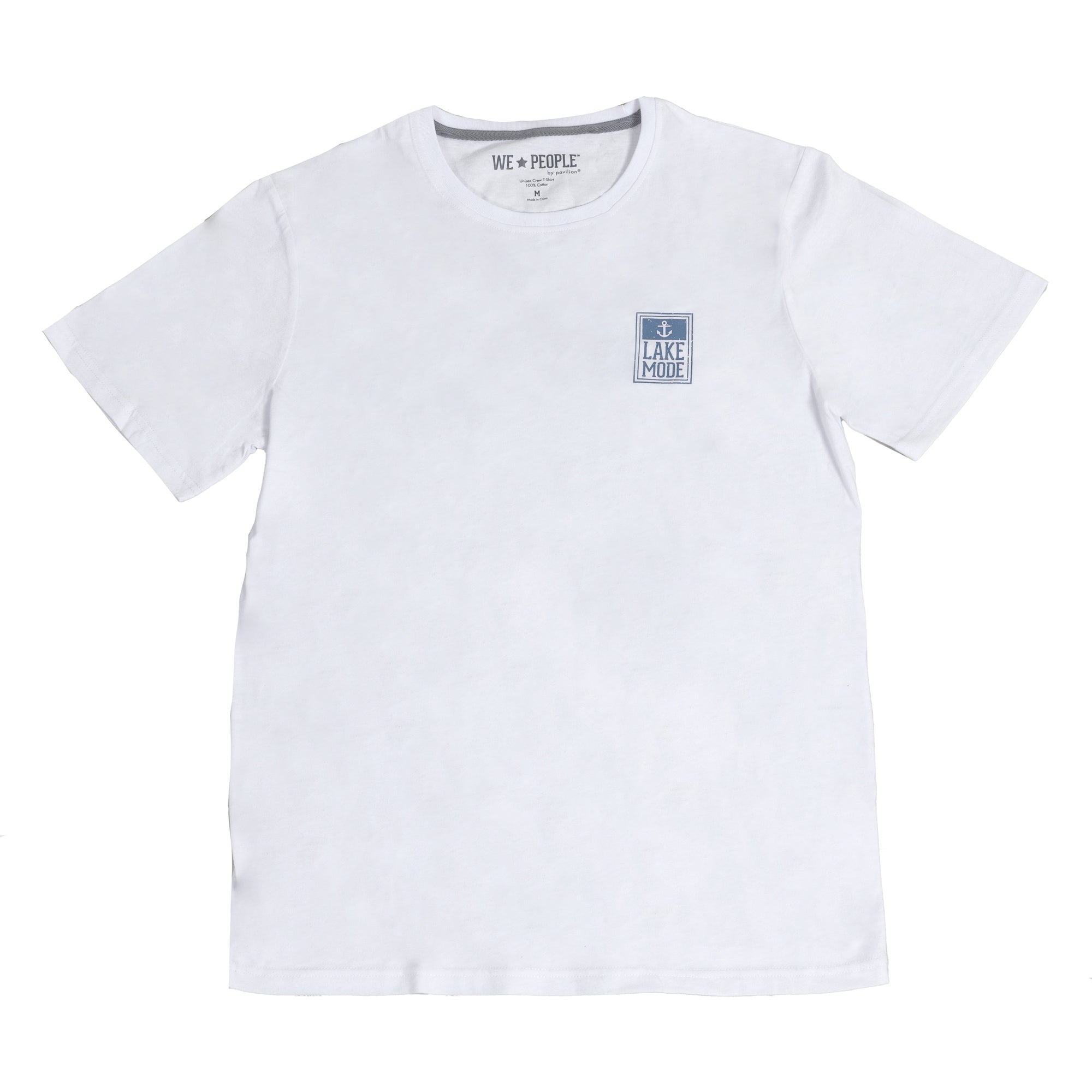 - IN-HOUSE DESIGN: The white shirt has a blue horizontal rectangular shape in the upper left chest area, which contains a white anchor & "LAKE MODE" sentiment inside an outlined design. The backside of the top has "MEANT FOR THE" in gray & "LAKE" in blue that stretches from each edge of the shoulder blade.