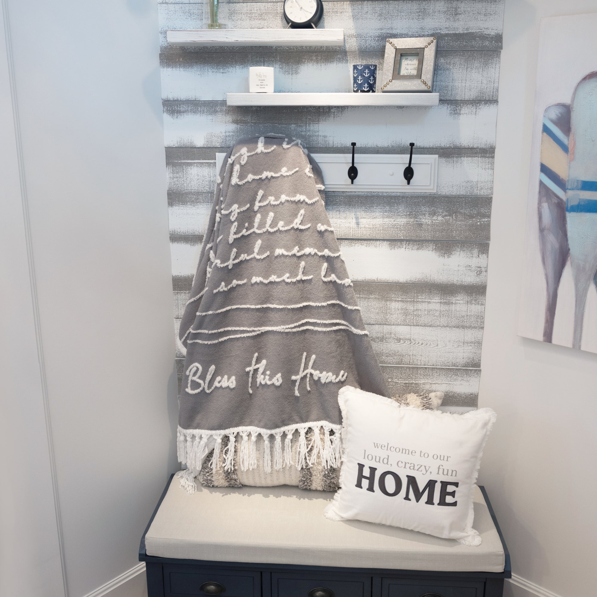 - IN-HOUSE DESIGN: Risen cursive sherpa "Grant Us Peace And Serenity In All Things, Let Our Family Overcome Whatever Life Brings. May We Find Happiness Big And Small, And Live In Comfort Through It All. This Home Is A Blessing From Above, To Be Filled With Wonderful Memories And So Much Love. Bless This Home" sentiment is conveyed by wave-like thread lines connecting the ends of the words to the edge of the blanket on a beautiful soft gray background.