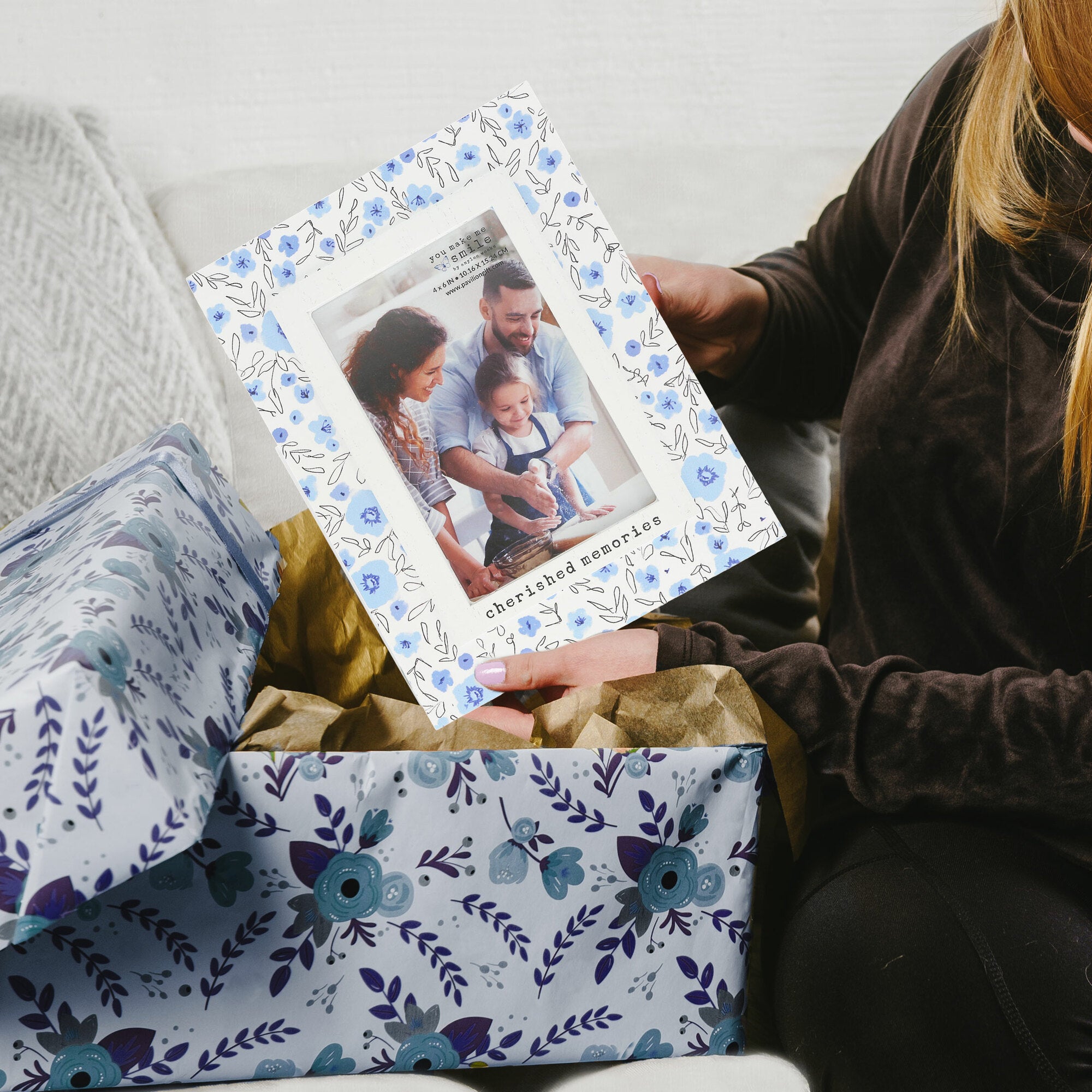 - IN-HOUSE DESIGN: "Cherished Memories" text and the accompanying blue floral pattern image are printed onto the front of the photo frame. The frame features a raised white wood trim around the photo rim. The backing is made from a thick cardboard-like material and four metal tabs for photo replacement.