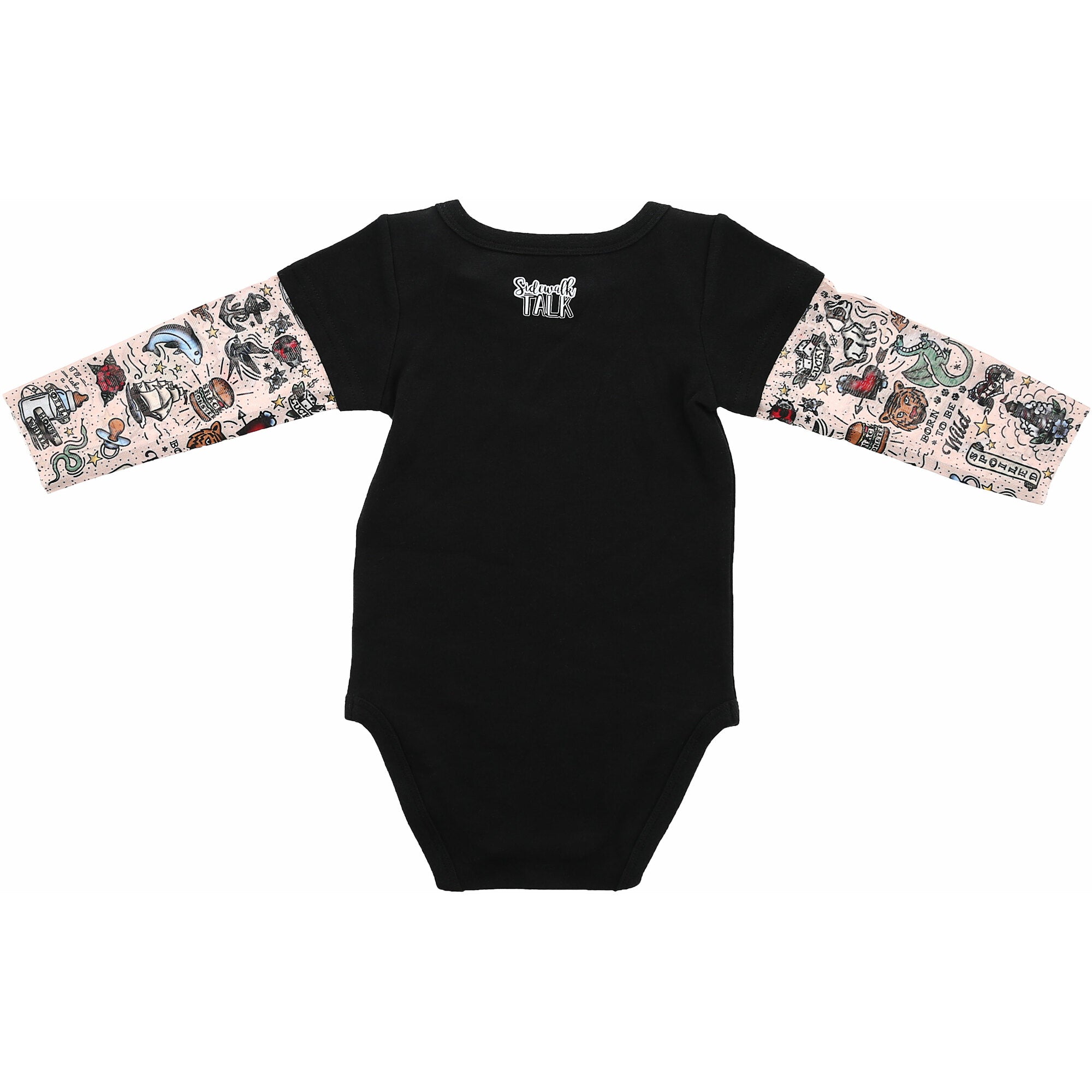 - IN-HOUSE DESIGN: The sleeves consist of new school-style inspired drawings, including puppies, pawprints, dice, hearts, stars, flowers, dragons, bottles, binkies, sailboats, waves, lighthouses, dolphins, tigers, birds, ladybugs, anchors, stars, snakes, polka dots, burgers, "Born To Be Wild," "Mom," "Spoiled," "I'll Take A Bottle Of House White," "Snack Monster," "Lucky," and more which all consist of the colors of the rainbow. The front chest center has a "Lil' Rock Star" sentiment.