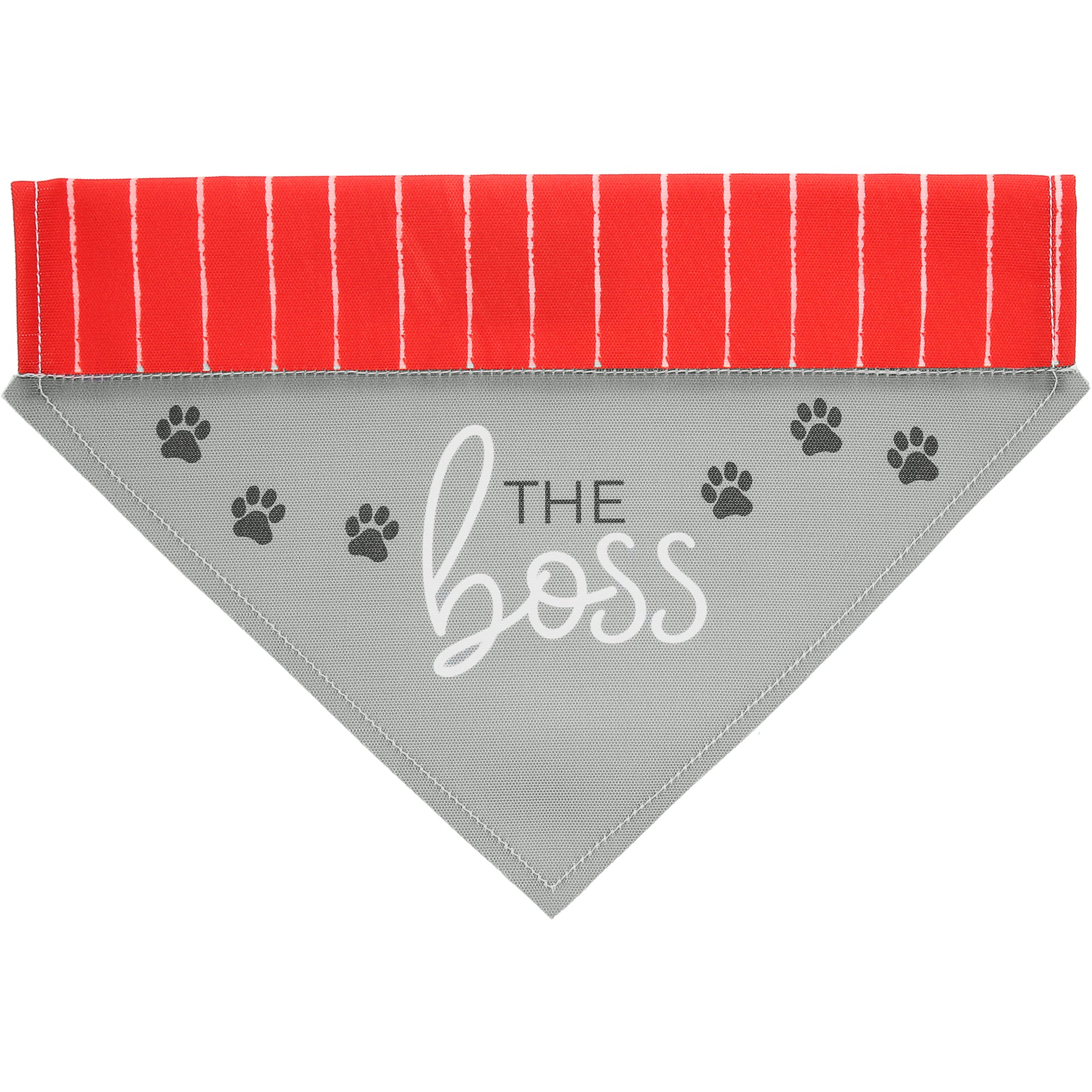 - IN-HOUSE DESIGN: The red background features a white vertical striped design on the over-the-collar part. The bottom gray section has a "The Boss" white and gray sentiment with a pawprint pattern. The backside has a sewn-in logo tag on the striped section and a soft touch finish for comfort finish on the bottom triangle part.