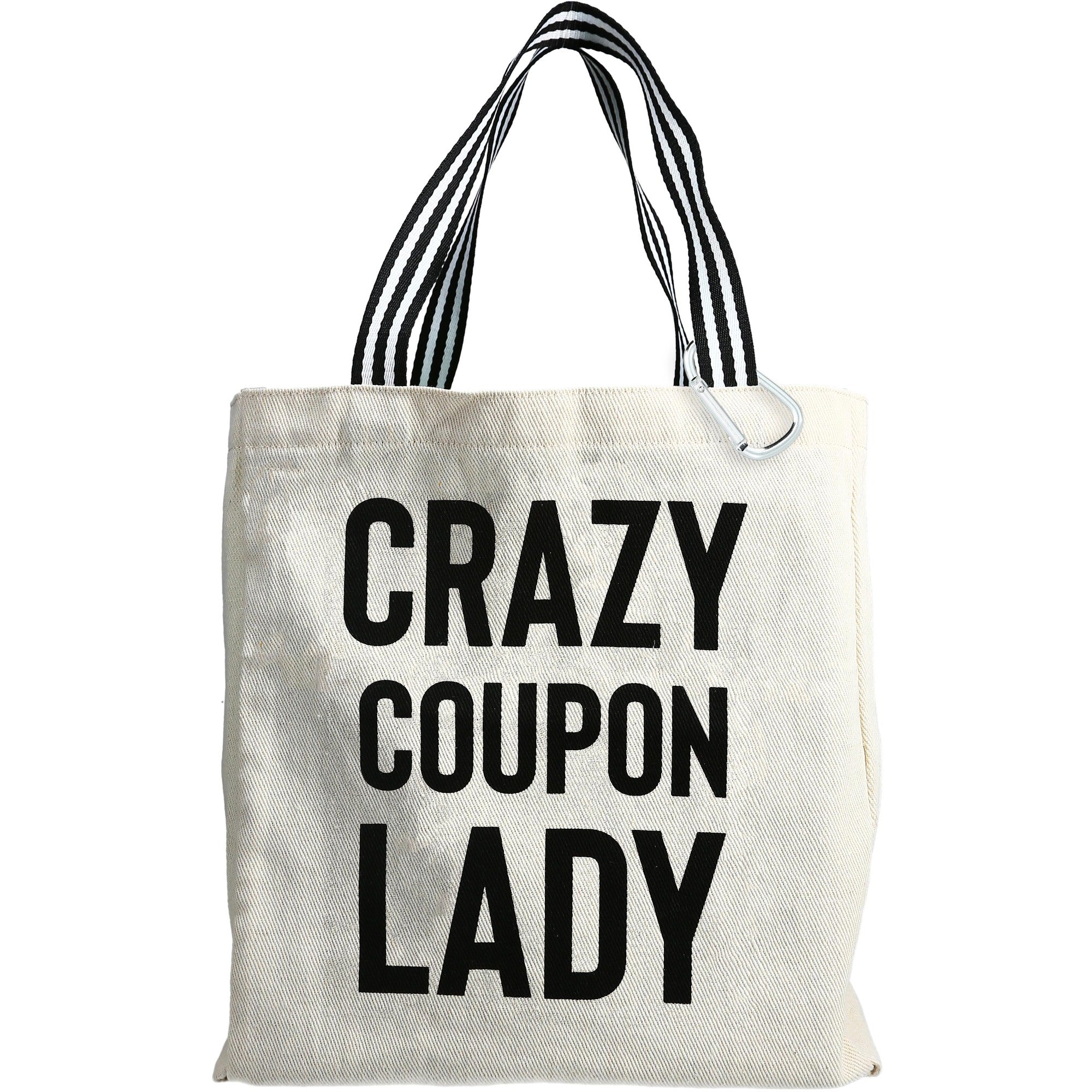- IN-HOUSE DESIGN: The white and black straps are sturdy and can be hand carried or placed over the shoulder for easy carrying. Features a humorous saying -Crazy Coupon Lady- printed onto the front of the handbag. The reusable bag comes packaged in a plastic poly bag with a hangtag.