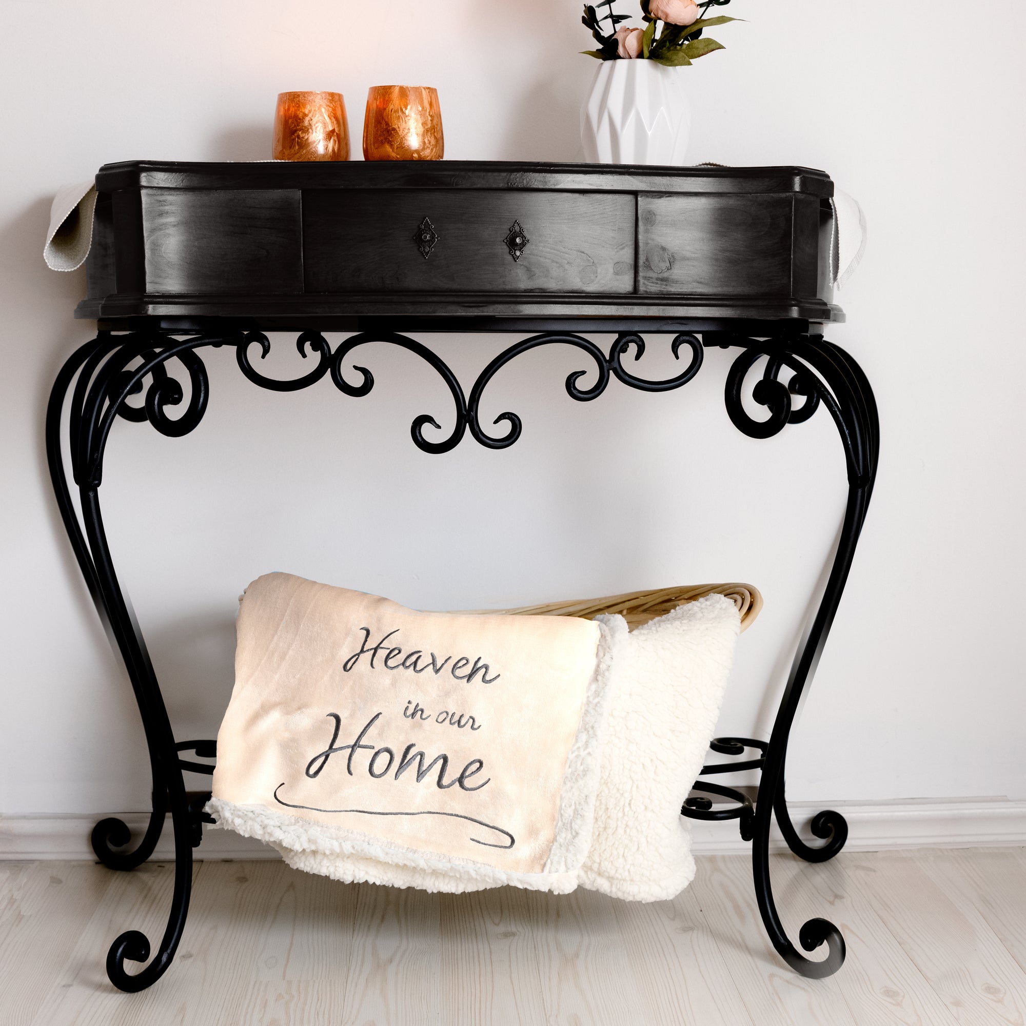 • IN-HOUSE DESIGN: The double-sided blanket has a debossed white embroidered "heaven in our home" sentiment matched by a scroll pattern on the cream-colored plush side of the blanket. The aromatherapeutic candle has a gray "heaven in our home" sentiment and scroll design. Socks have a gray ankle, heel, and toe accompanied by a heart and swirl design on a white sock base.
