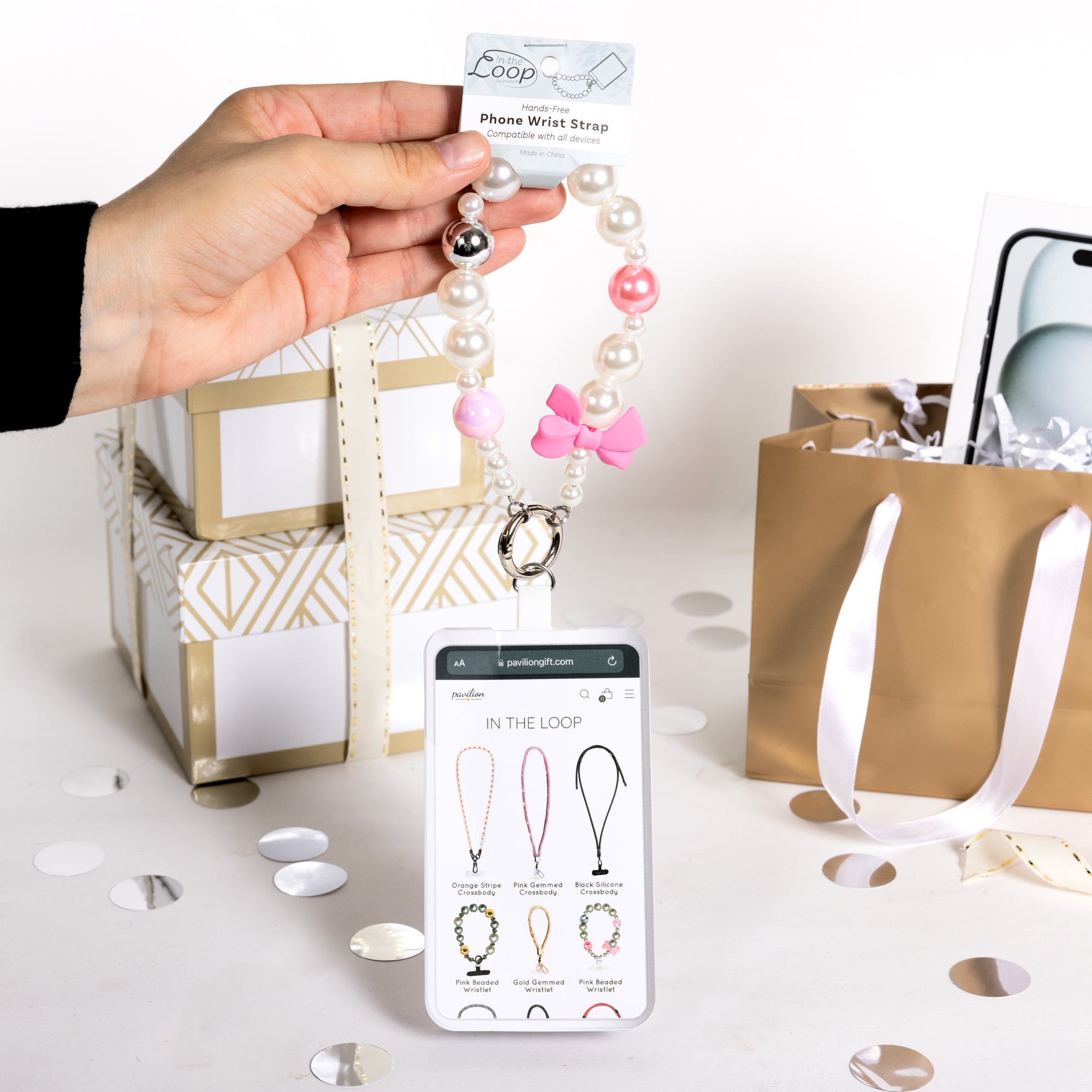 - IN-HOUSE DESIGN: The soft pink bow and matching pink marbled beads bring a cute, feminine touch, while the Pavilion-branded tab makes attachment easy and secure.