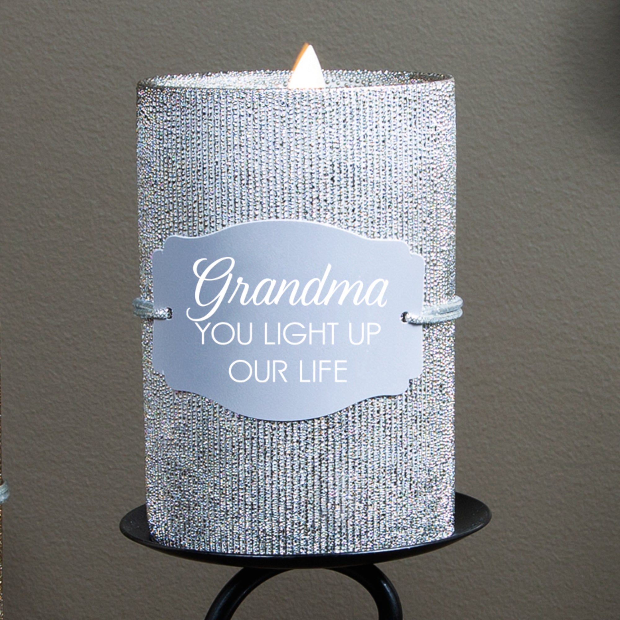 - IN-HOUSE DESIGN: "Grandma; You Light Up Our Life" foil-wrapped text label is wrapped around the glitter candle using a silver cord.