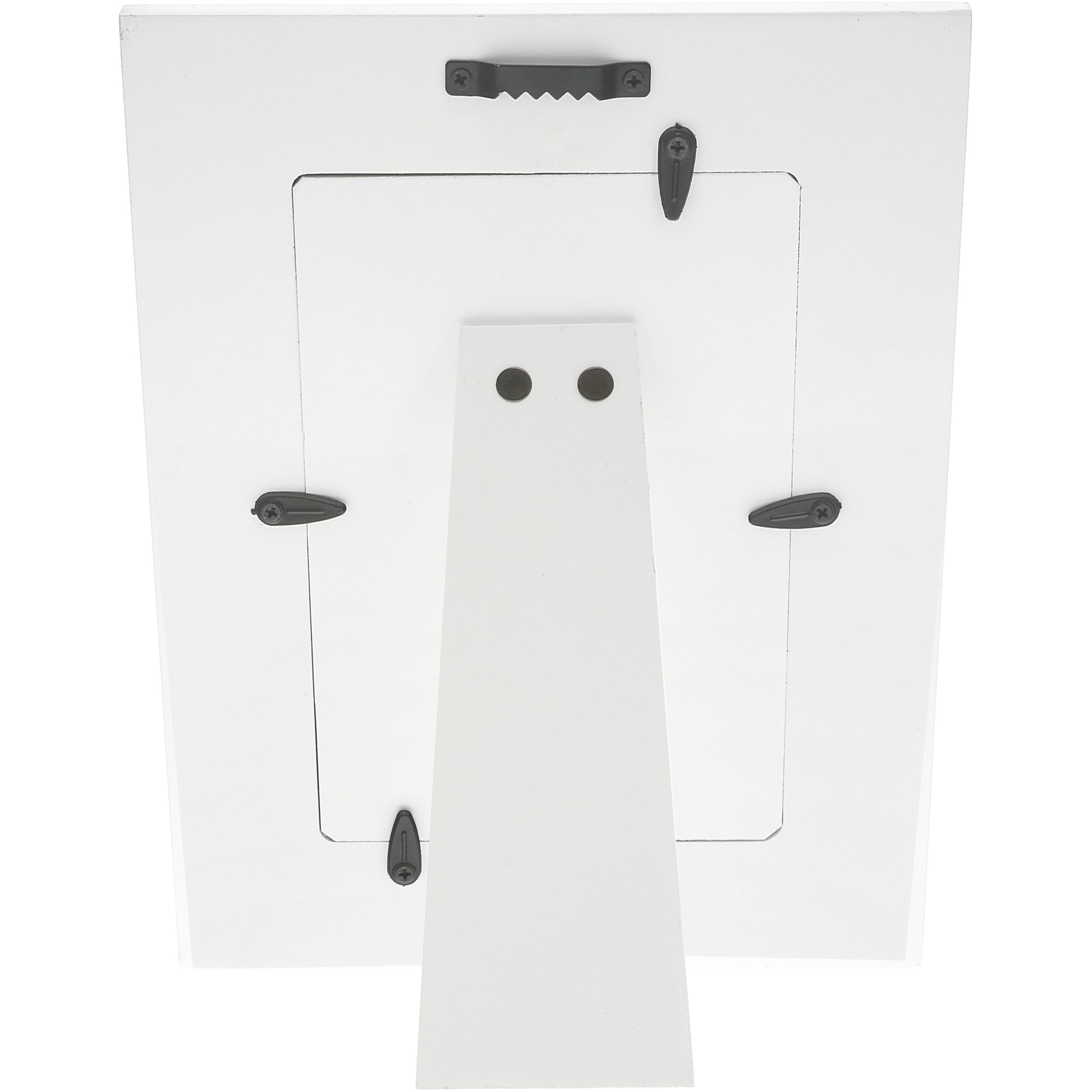 - IN-HOUSE DESIGN: "Cherished Memories" text and the accompanying blue floral pattern image are printed onto the front of the photo frame. The frame features a raised white wood trim around the photo rim. The backing is made from a thick cardboard-like material and four metal tabs for photo replacement.
