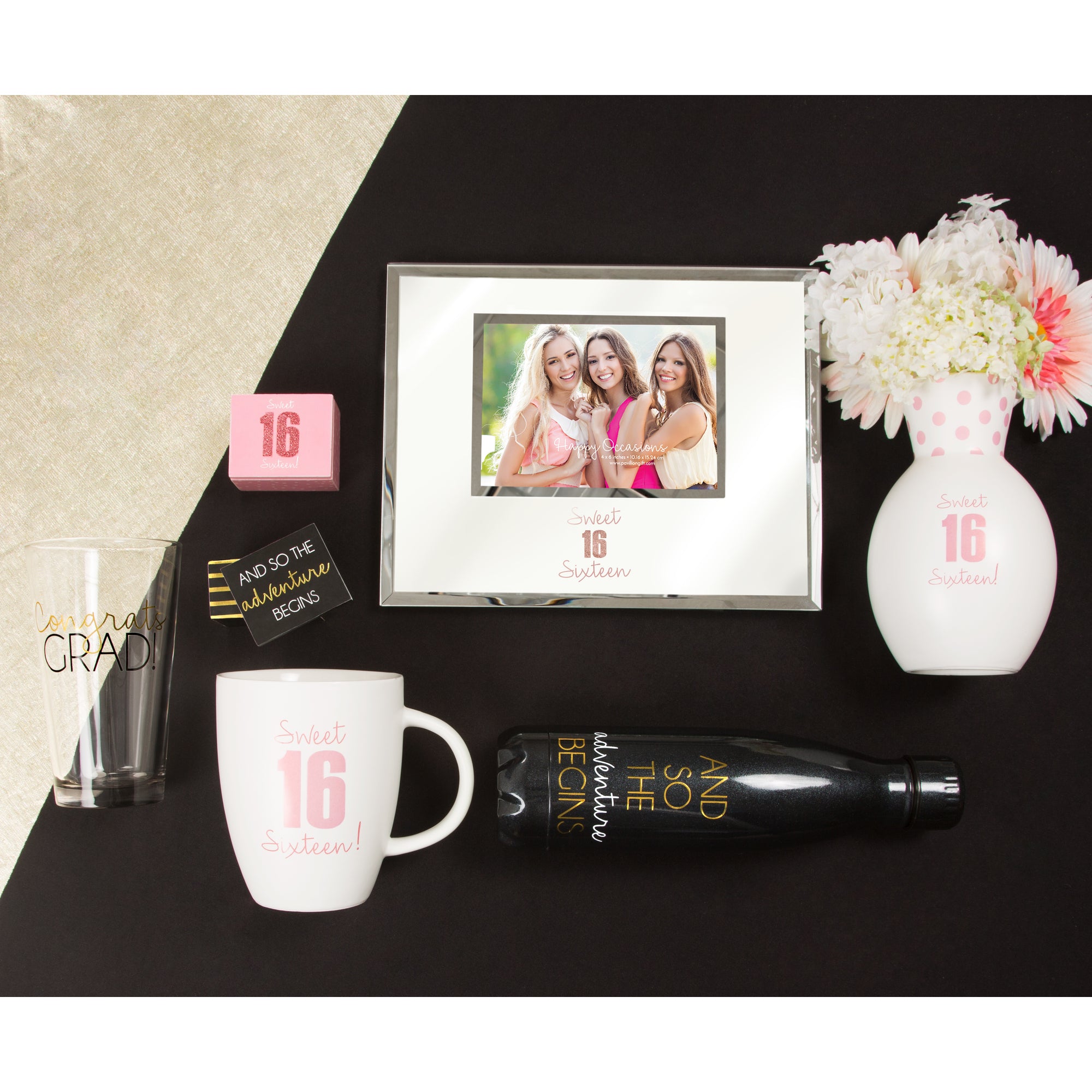 - IN-HOUSE DESIGN: "Sweet '16' Sixteen!" text is printed onto the front of the vase, while the pink dot design is printed all around the top of the vase.