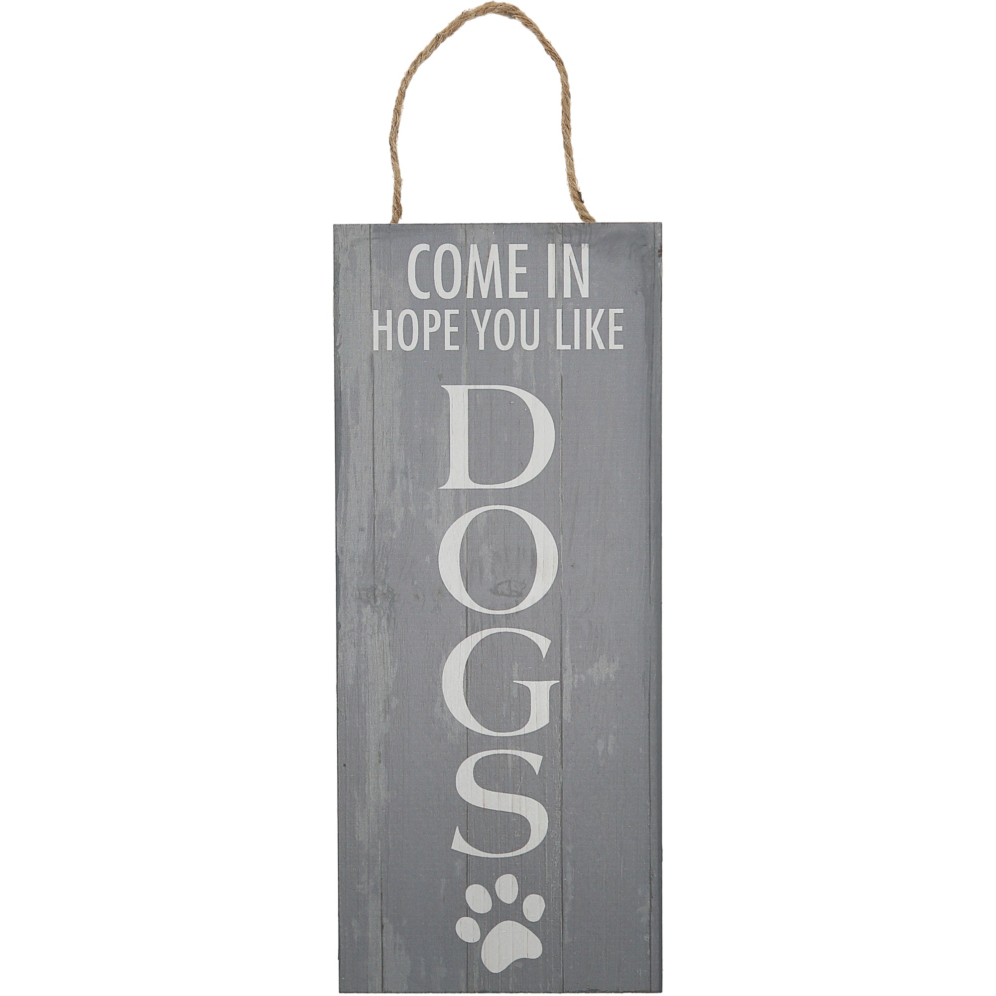 - IN-HOUSE DESIGN: The cool gray rustic-finished textured four-section boarded front has a glossy white "Come In Hope You Like Dogs" sentiment decal and a pawprint. The flat-backing has a natural pine finish.