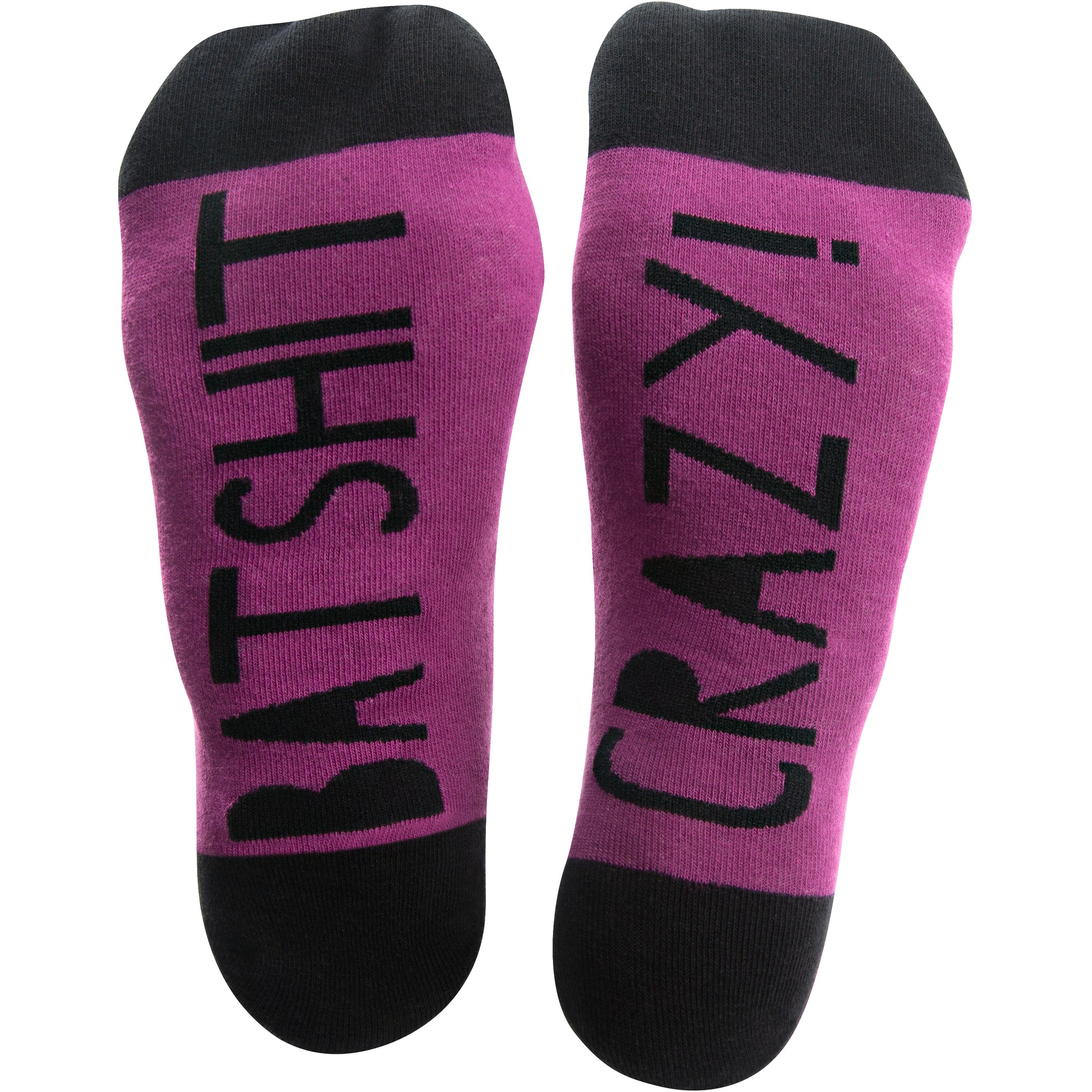 - IN-HOUSE DESIGN: "Bat Shit Crazy!" text is sewn into the base of the socks and is accompanied by a bat pattern with "Cray Cray Queen" text.