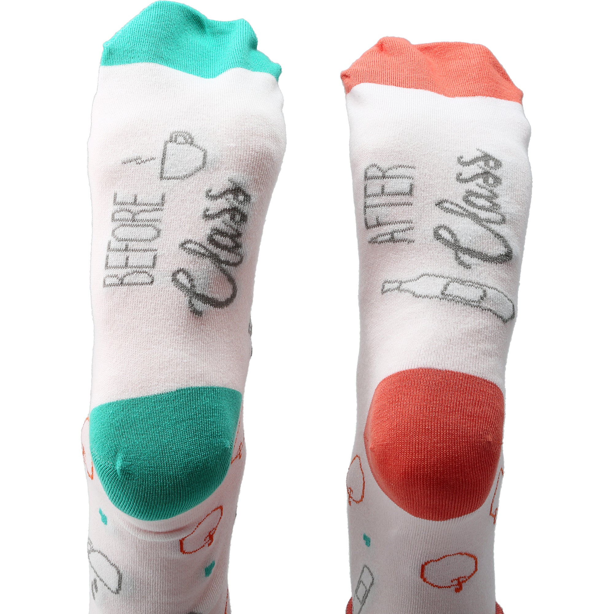 - IN-HOUSE DESIGN: Orange/green ankle, heel, and toes are attached to overall white bodies. The green sock has coffee cups, apples, and hearts with "Before Class" and a large coffee cup in gray on the bottom of the sock. The orange sock has wine bottles, apples, and hearts with an "After Class" and a large alcohol bottle on the bottom of the sock.
