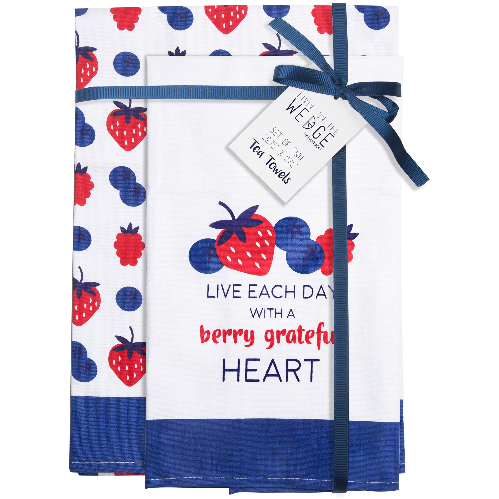 - IN-HOUSE DESIGN: "Live Each Day With A Berry Grateful Heart" text is printed onto the front of one tea towel and a blueberry and strawberry pattern is printed onto the other.