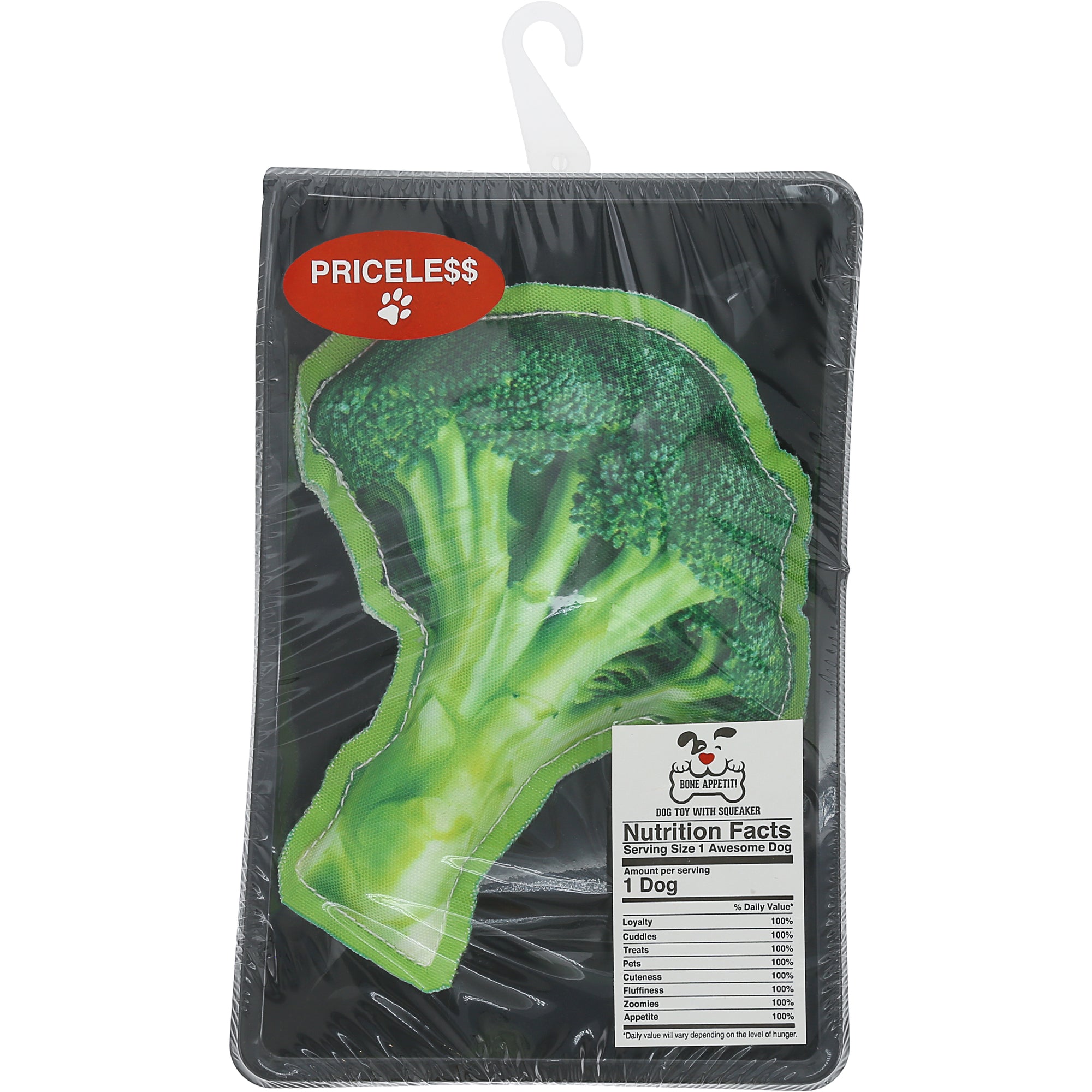 • PREMIUM QUALITY: This 6.25" tall, 5.5" long & 1.25" wide realistic broccoli dog toy is made from durable materials—polyester and natural cotton. The edges of the toy have a weathered rustic look. The fluffed-up polyester fiber-filled center with white stitching shapes contains a single plastic squeaker with a branded tag below on the backside.