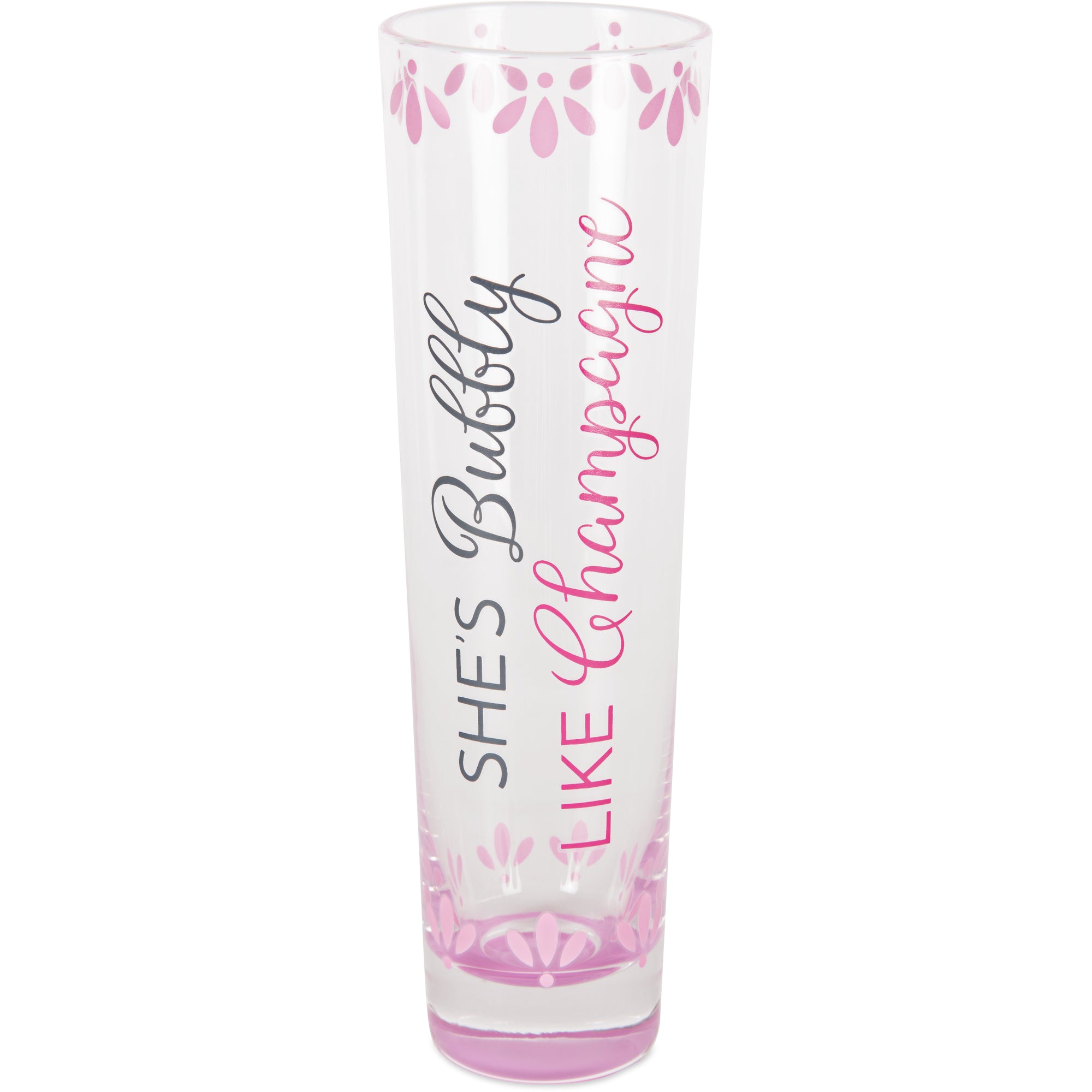 - IN-HOUSE DESIGN: Featuring the playful and trendy phrase, "She’s Bubbly Like Champagne," this flute captures the joyful, bubbly personality of its owner. The script and block typography create a modern and chic aesthetic, while the delicate pink floral details and feminine blush-tone base add a soft and elegant touch. The combination of whimsical design and glamorous gold accents makes this flute Instagram-worthy and perfect for any celebration.