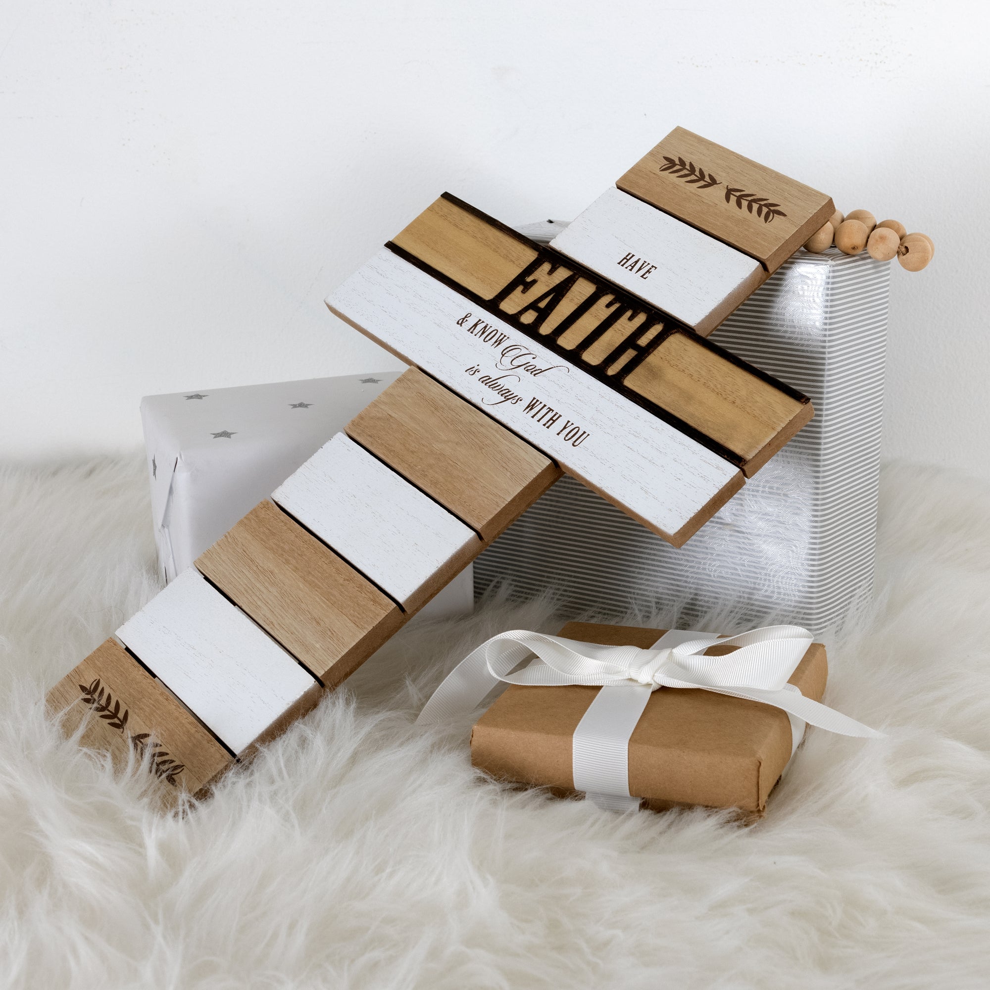 - IN-HOUSE DESIGN: The striped pattern consists of natural and white-washed wood colorations. The "Faith" is bronze metal. The "Have" and "& Know God Is Always With You" and the greenery design on the first and last sections are printed with a bronze-colored finish.