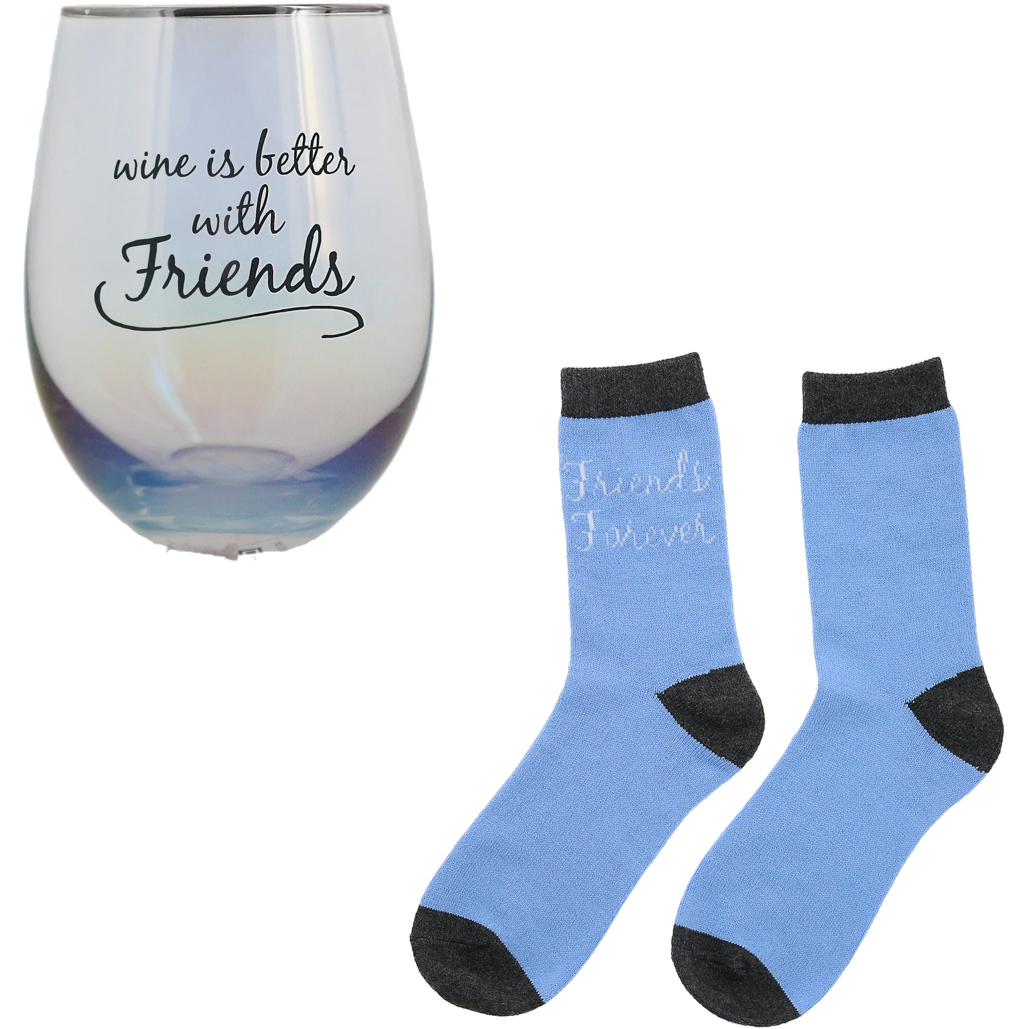 - IN-HOUSE DESIGN: The wine glass has an iridescent blue finish, an electroplated lip, and a “Wine Is Better With Friends” sentiment with a ray of overarching sunshine. The socks have a gray ankle, toe & heel with a blue body and a white “Wine Is Better With Friends” sentiment on the outer upper of the crew boot socks.