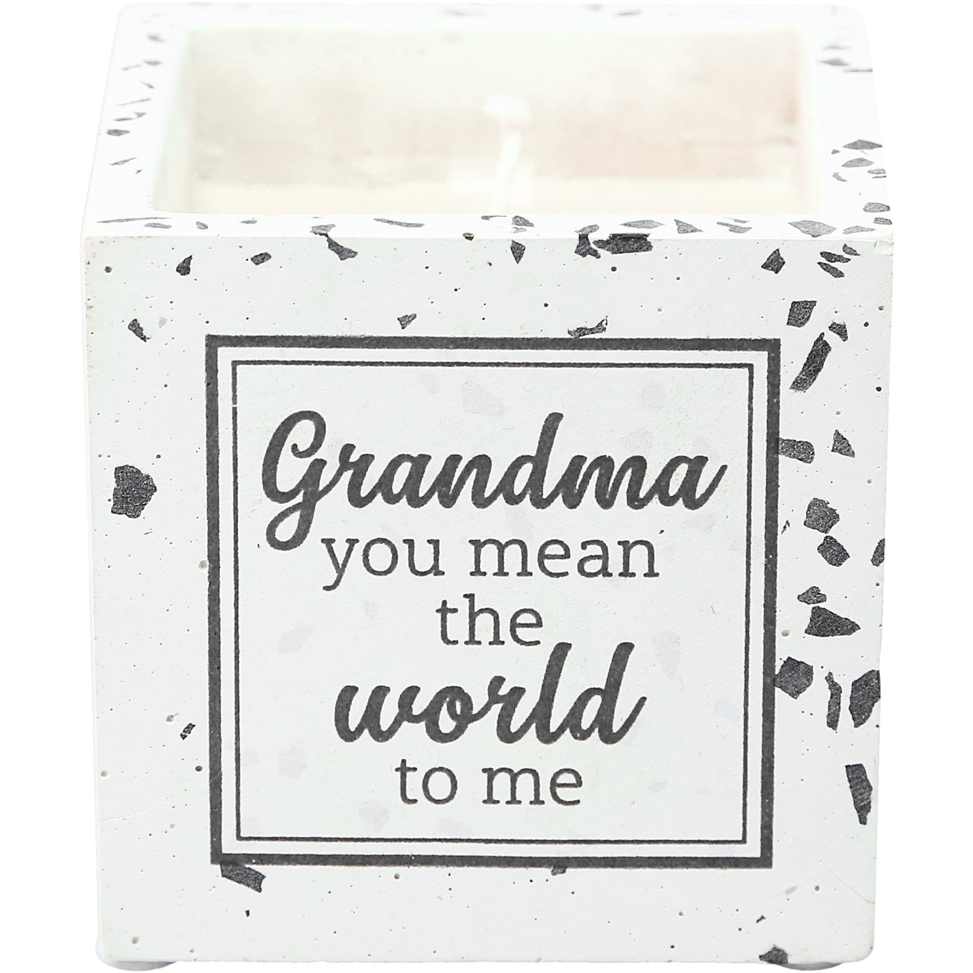 - IN-HOUSE DESIGN: White square candle with a gray speckled pattern is accompanied by "Grandma You Mean The World To Me" glossy gray sentiment on the front side. The artwork was created with simplistic neutral tones to fit into any home.