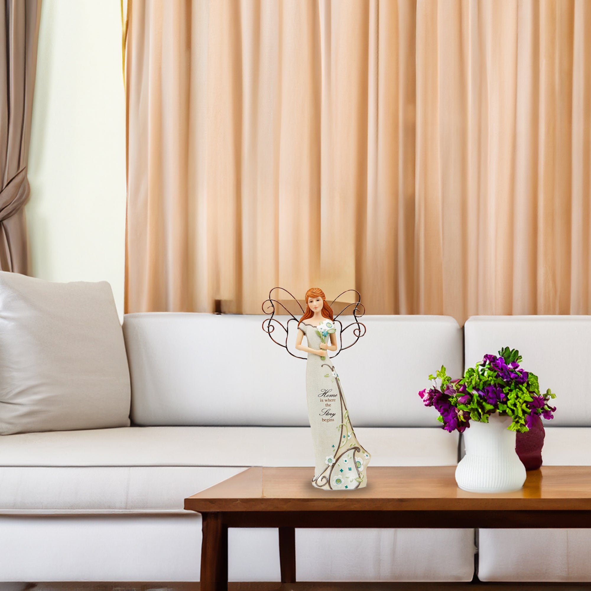 - IN-HOUSE DESIGN: "Home Is Where The Story Begins" text is inscribed onto the front of the hand-painted angel.