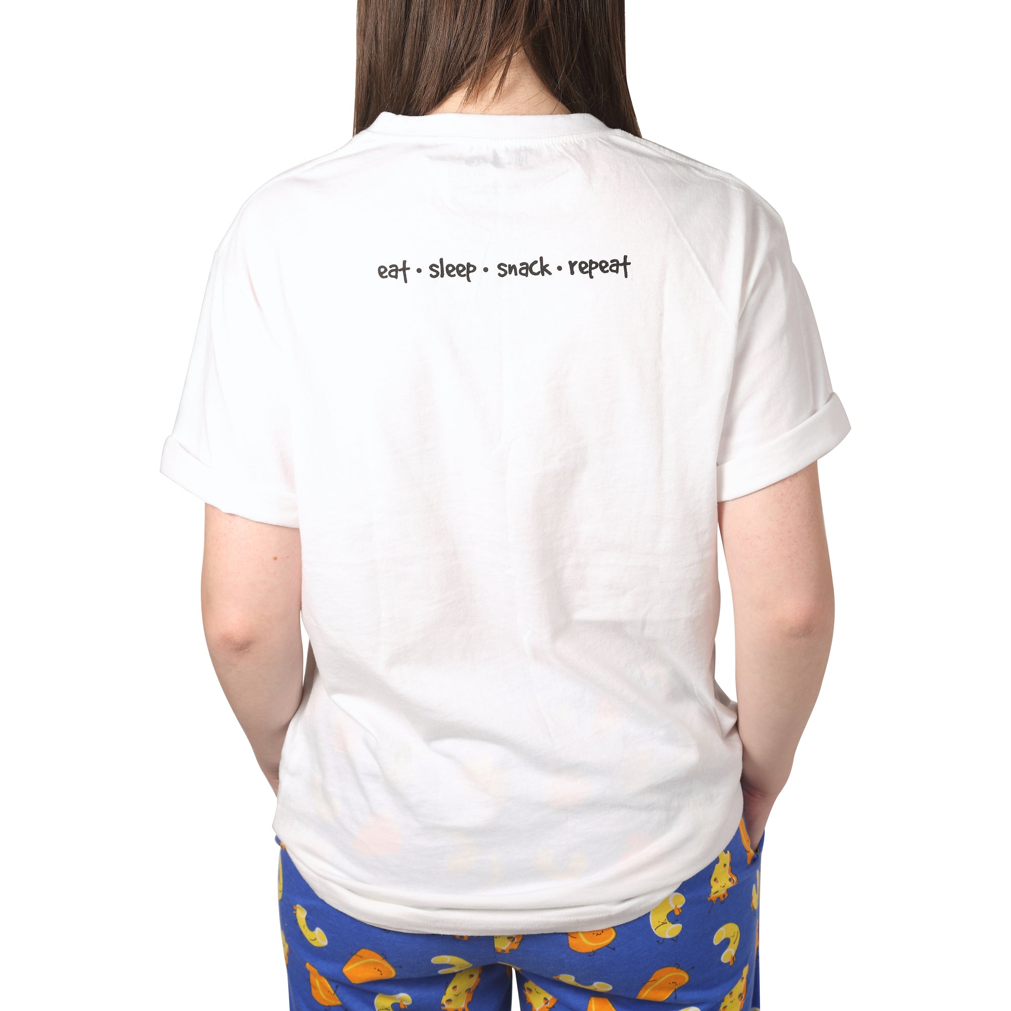- IN-HOUSE DESIGN: "Snackin' And Relaxin'" text is printed on the front of the t-shirt, alongside the printed macaroni and cheese icons. "Eat. Sleep. Snack. Repeat." text is printed on the back of the t-shirt.