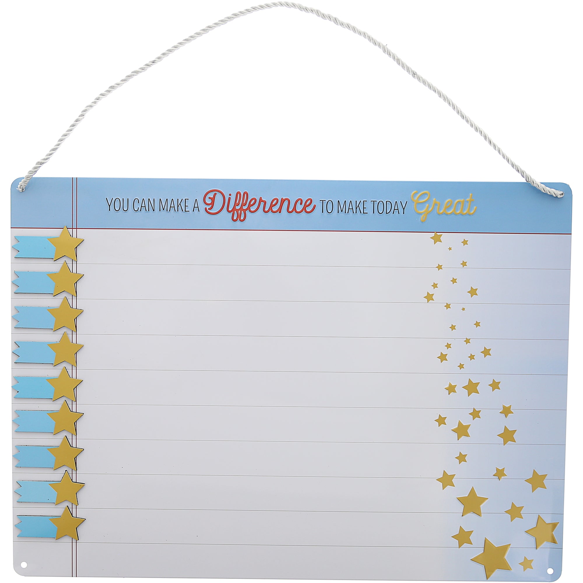 • IN-HOUSE DESIGN: The board has the embossed black, red, and gold sentiment "You Can Make A Difference To Make Today Great" on the top center of the blue, white, and red paper-lined notepad design. The stars are gold with a blue tail that leaves room for writing names or tasks for classroom activities. The falling golden star pattern features a handful of embossed stars; these stars are the achievable end zone goal.