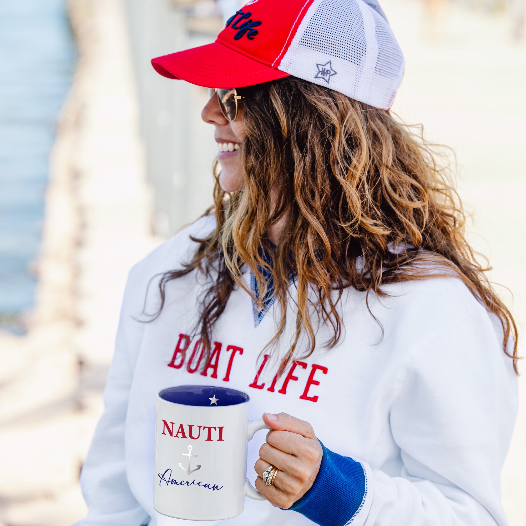 - IN-HOUSE DESIGN: "Nauti American" is printed on the front of mug with silver decal highlight.