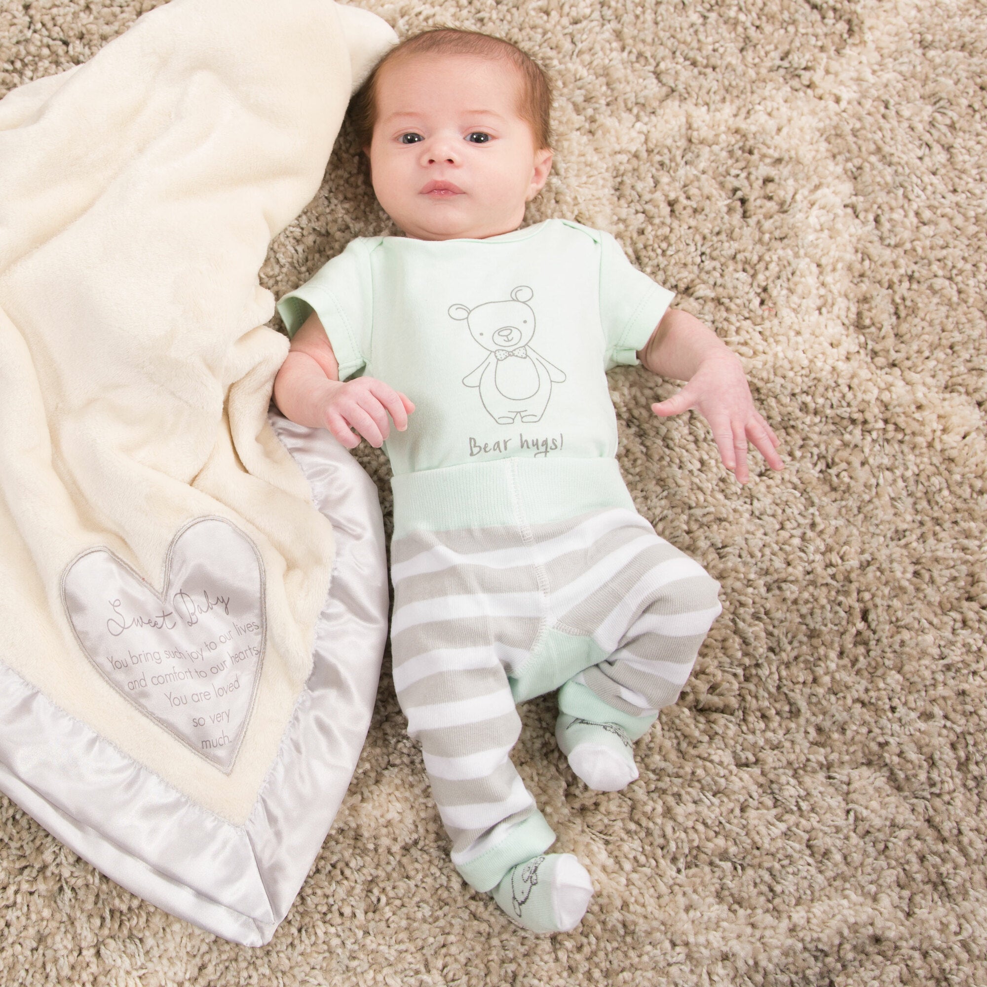 - IN-HOUSE DESIGN: "Bear Hugs!" text and accompanying bear image are both printed onto the front of the bodysuit.