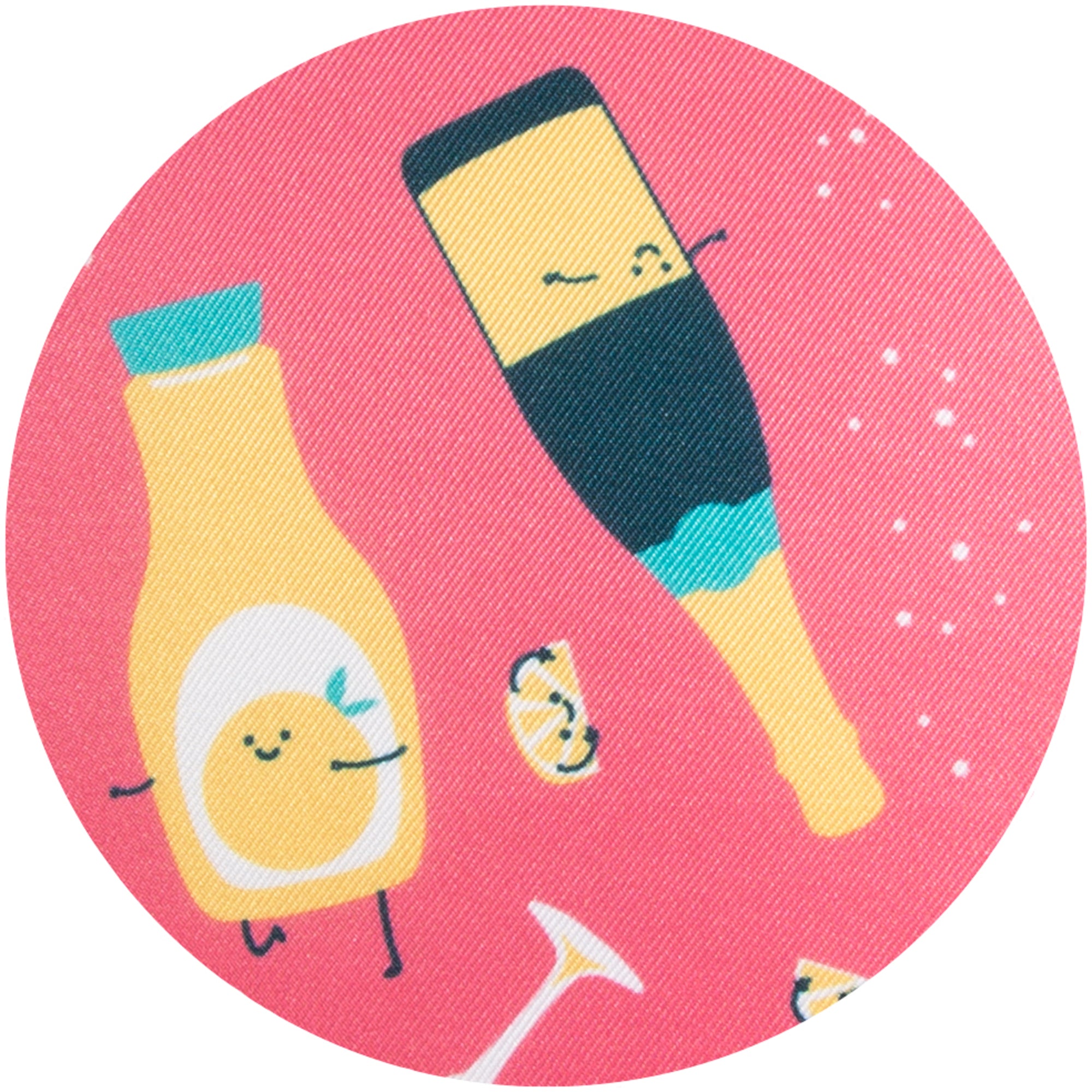 - IN-HOUSE DESIGN: "Start And End Your Day Sparkling" text is printed on the front, while the back features a champagne bottle, orange juice, and glass pattern.