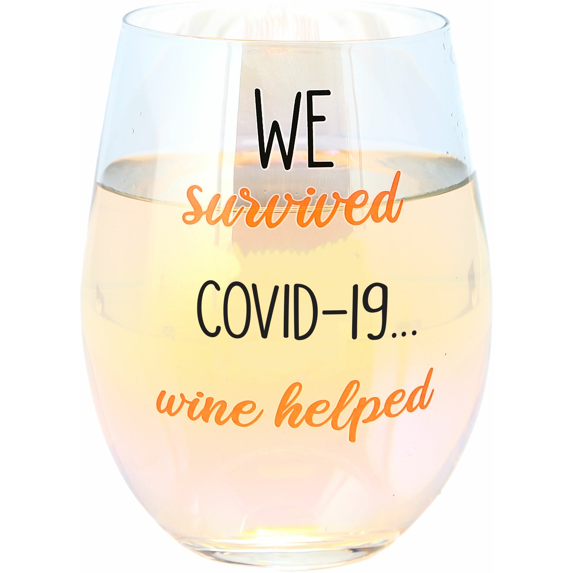 - IN-HOUSE DESIGN: "We Survived Corona 2020...wine helped" text is heat-printed onto the front of the glass.