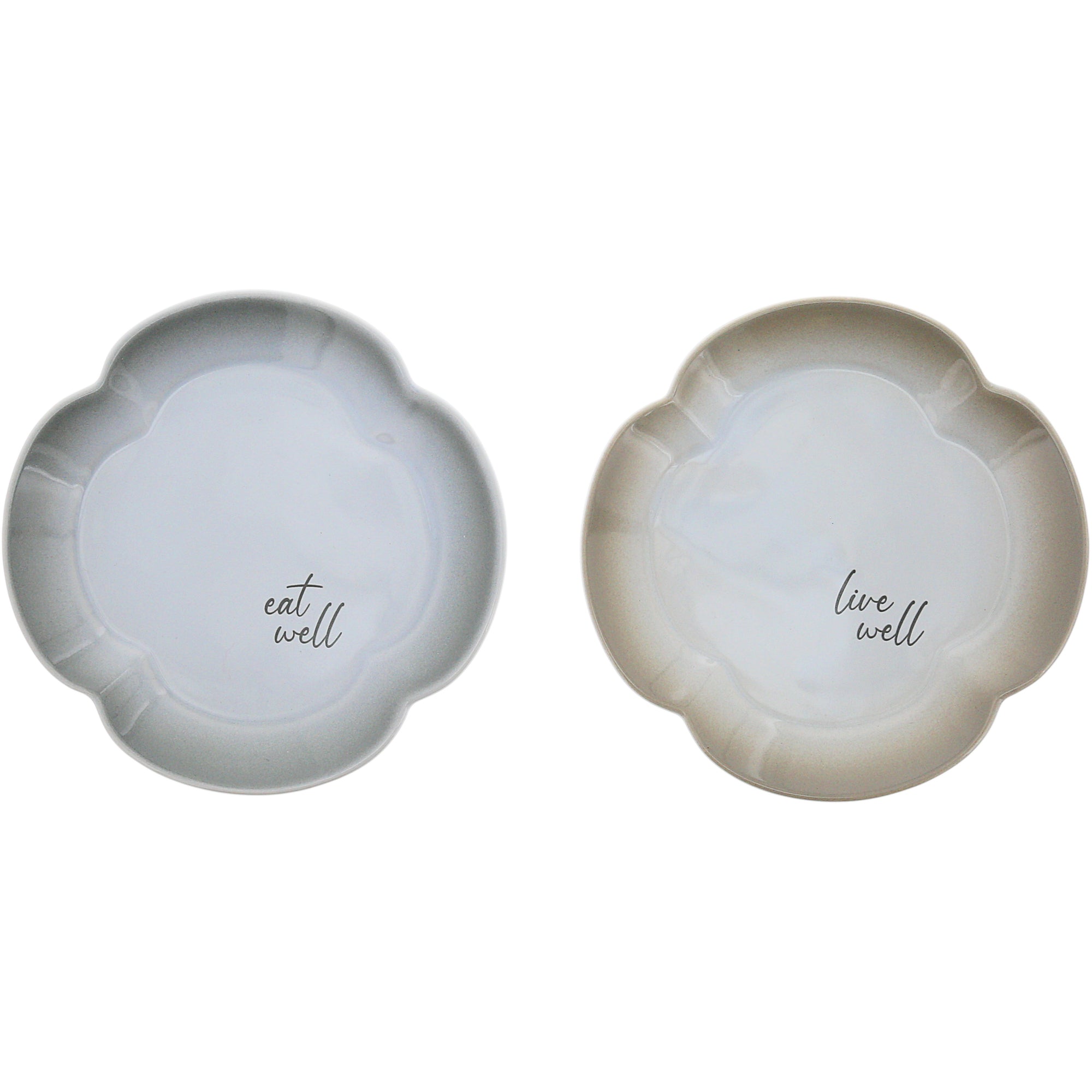 • IN-HOUSE DESIGN: "Eat Well" sentiment is heat stamped into the bottom right of the cool gray plate, whereas "Live Well" is imprinted onto the warm gray plate. A quatrefoil floral clover-shaped edge accompanies the ombre effect on each component.