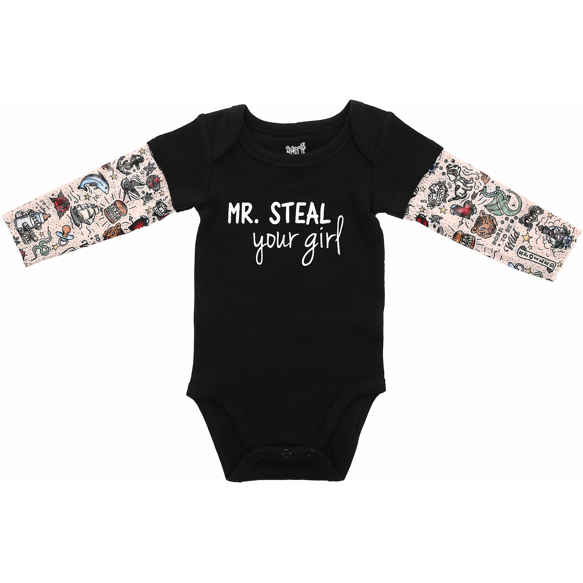 - IN-HOUSE DESIGN: The sleeves consist of new school-style inspired drawings, including puppies, pawprints, dice, hearts, stars, flowers, dragons, bottles, binkies, sailboats, waves, lighthouses, dolphins, tigers, birds, ladybugs, anchors, stars, snakes, polka dots, burgers, "Born To Be Wild," "Mom," "Spoiled," "I'll Take A Bottle Of House White," "Snack Monster," "Lucky," and more which all consist of the colors of the rainbow. The front chest center has a "Mr. Steal Your Girl" sentiment.