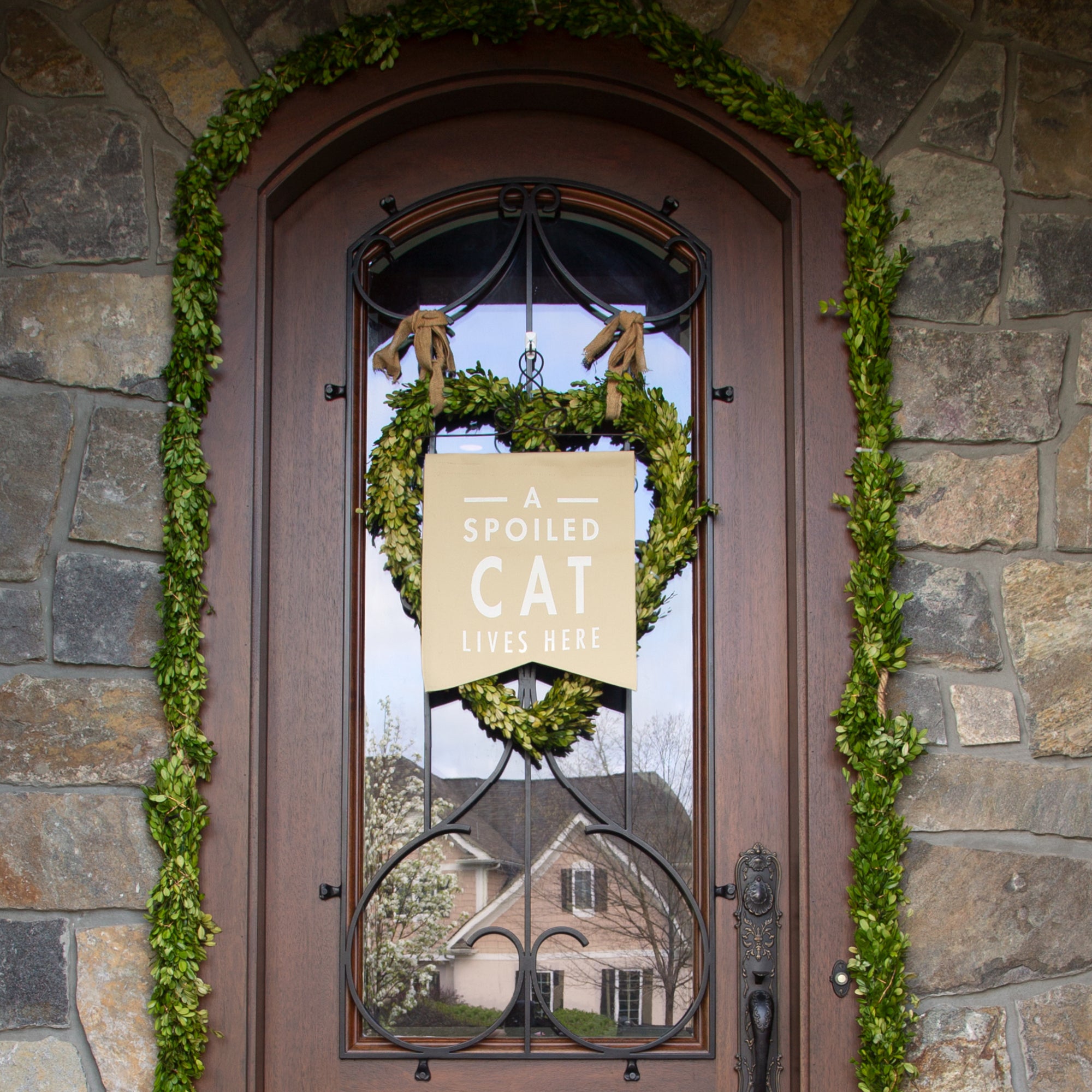 - IN-HOUSE DESIGN: "A Spoiled Cat Lives Here" text is printed onto the front of the banner.