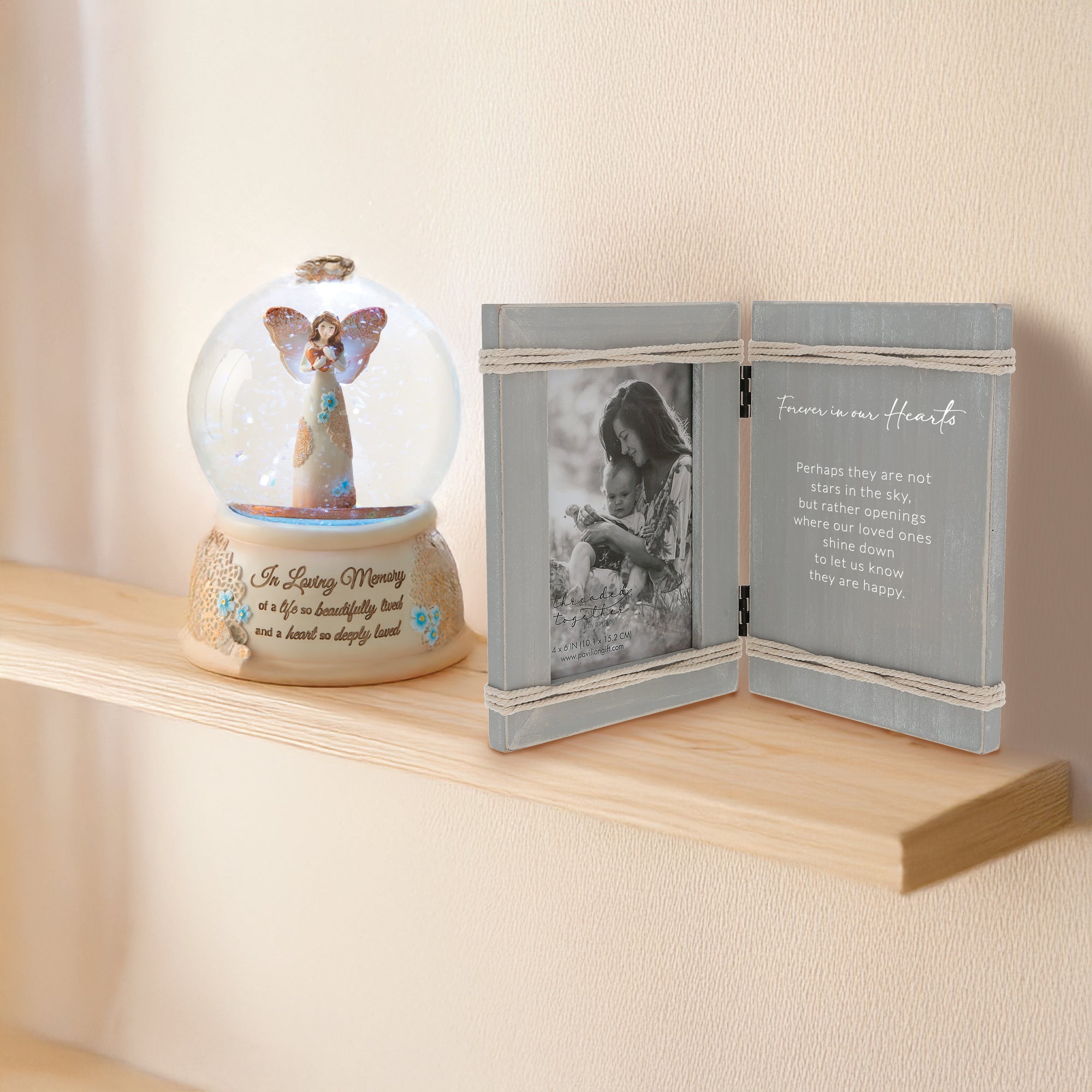 - IN-HOUSE DESIGN: The base features the touching inscription, "In Loving Memory Of A Life So Beautifully Lived And A Heart So Deeply Loved," debossed and hand-painted with intricate butterfly and floral accents. The water globe contains an LED-lit angel figurine surrounded by a gentle snow-like effect, adding an ethereal glow.