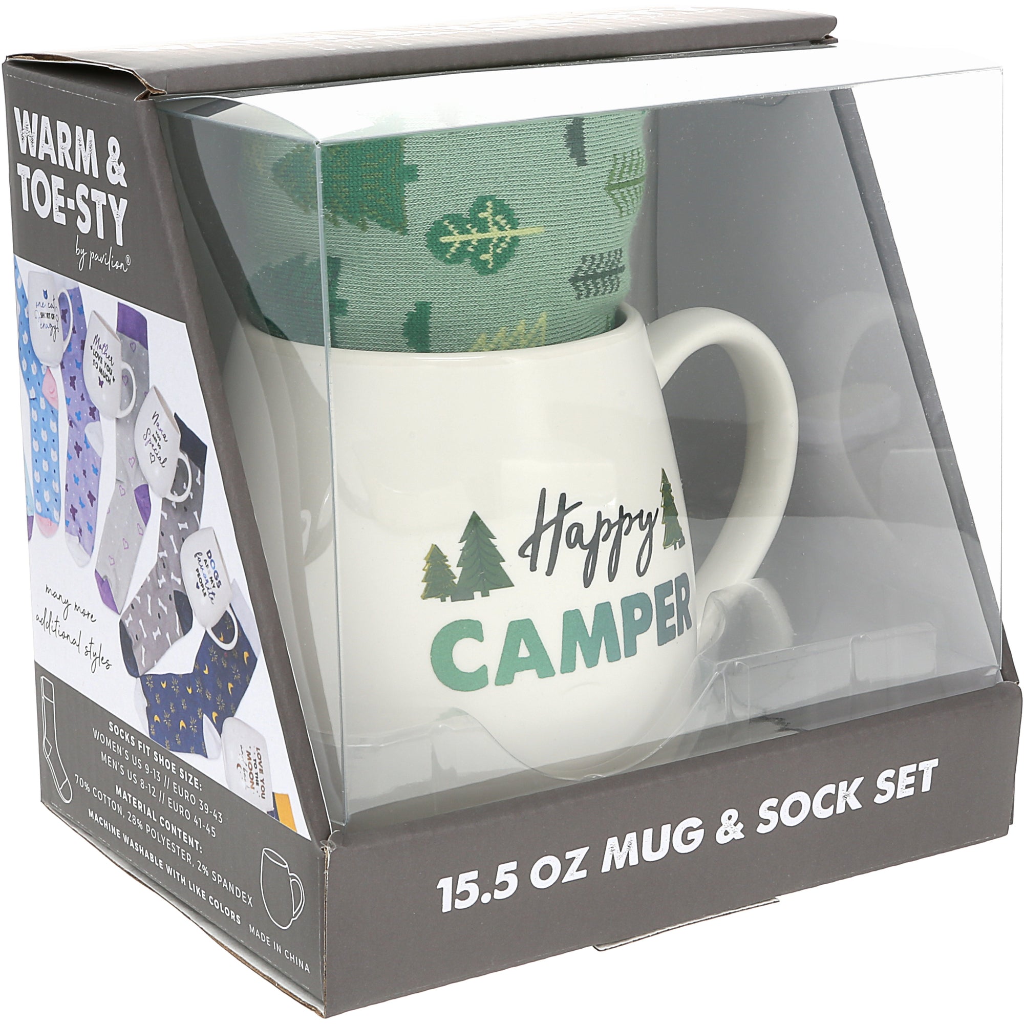 • IN-HOUSE DESIGN: The socks feature various green shrubs, pine trees, and maple tree patterns on a light green background. The heels, toes, and ankles are dark green. The mug has a sparkly green and black "Happy Camper" sentiment and several pine tree glossy decals on one side.