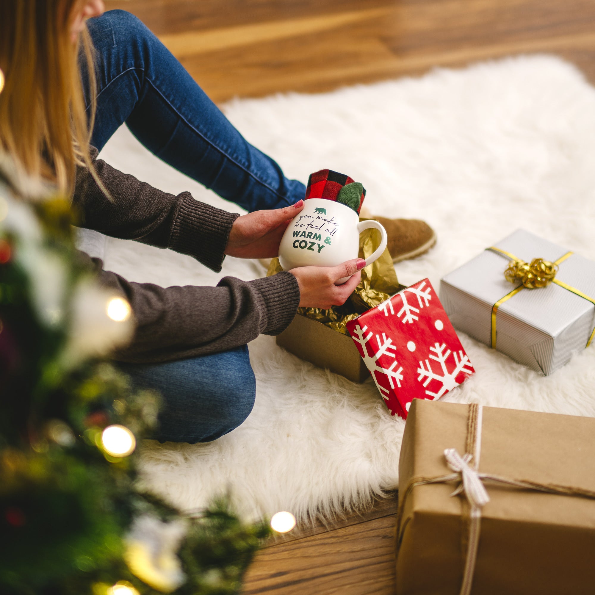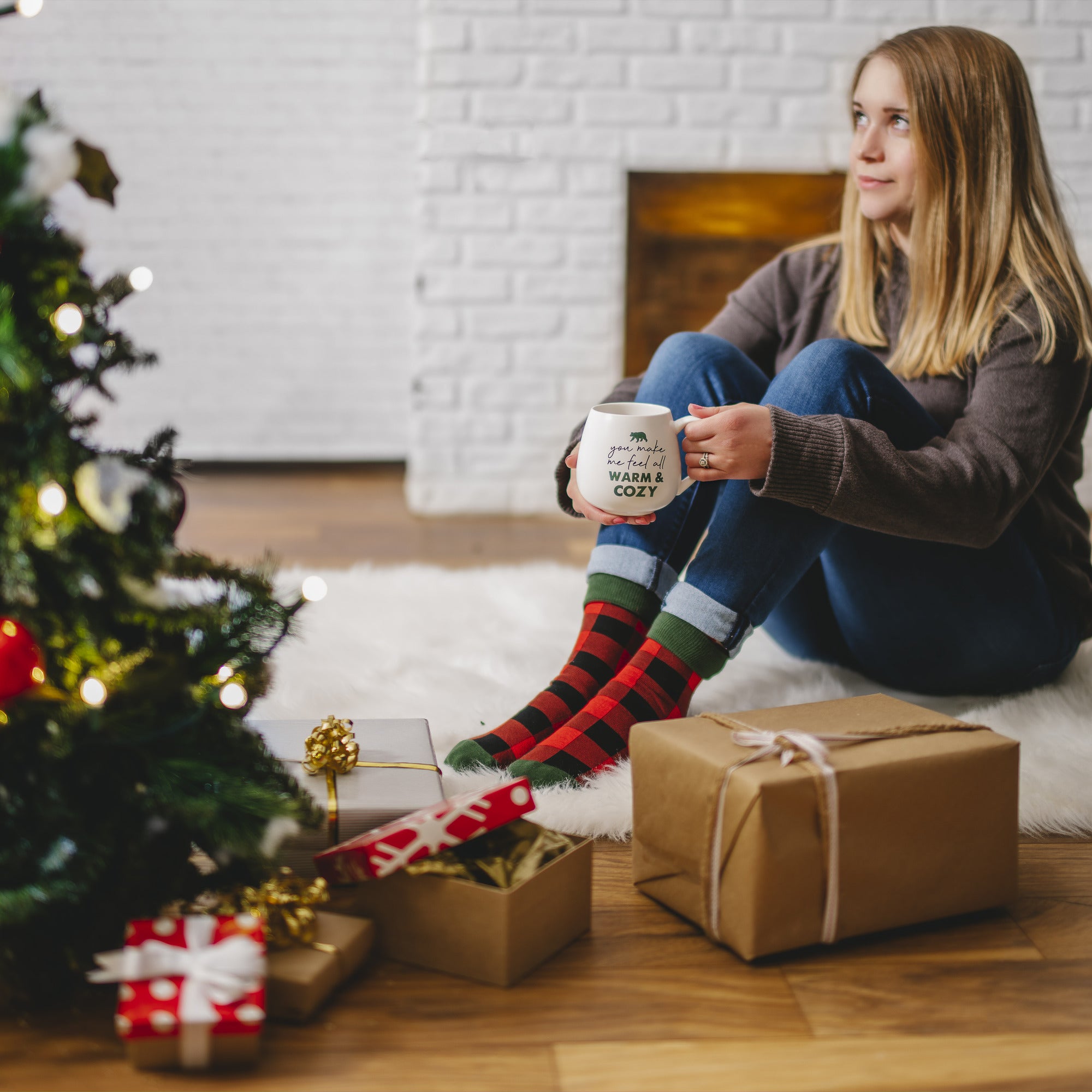 - IN-HOUSE DESIGN: "You Make Me Feel All Warm & Cozy" text and accompanying design is printed onto the front of the mug, while the socks feature a sewn-in plaid pattern.