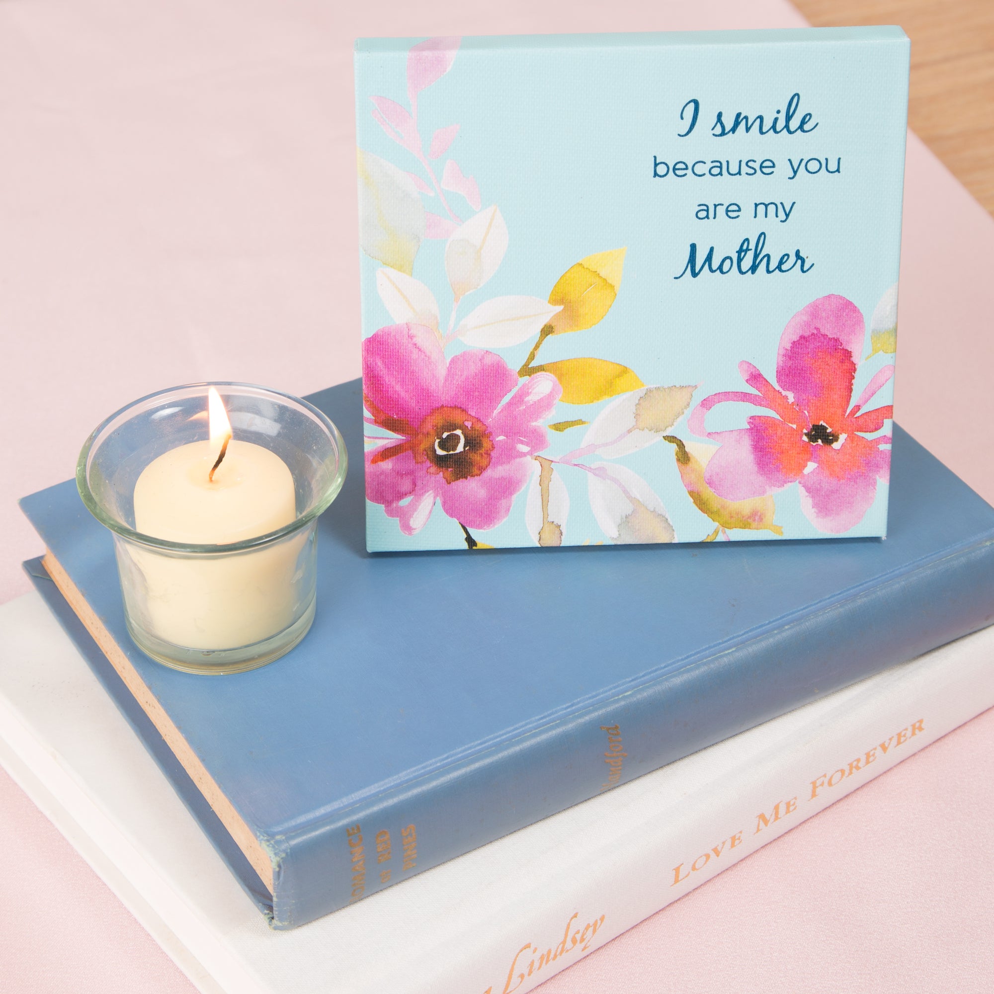 - IN-HOUSE DESIGN: Designed by Stephanie Ryan, "I Smile Because You Are My Mother" text is printed onto plaque, as is the accompanying floral detail.