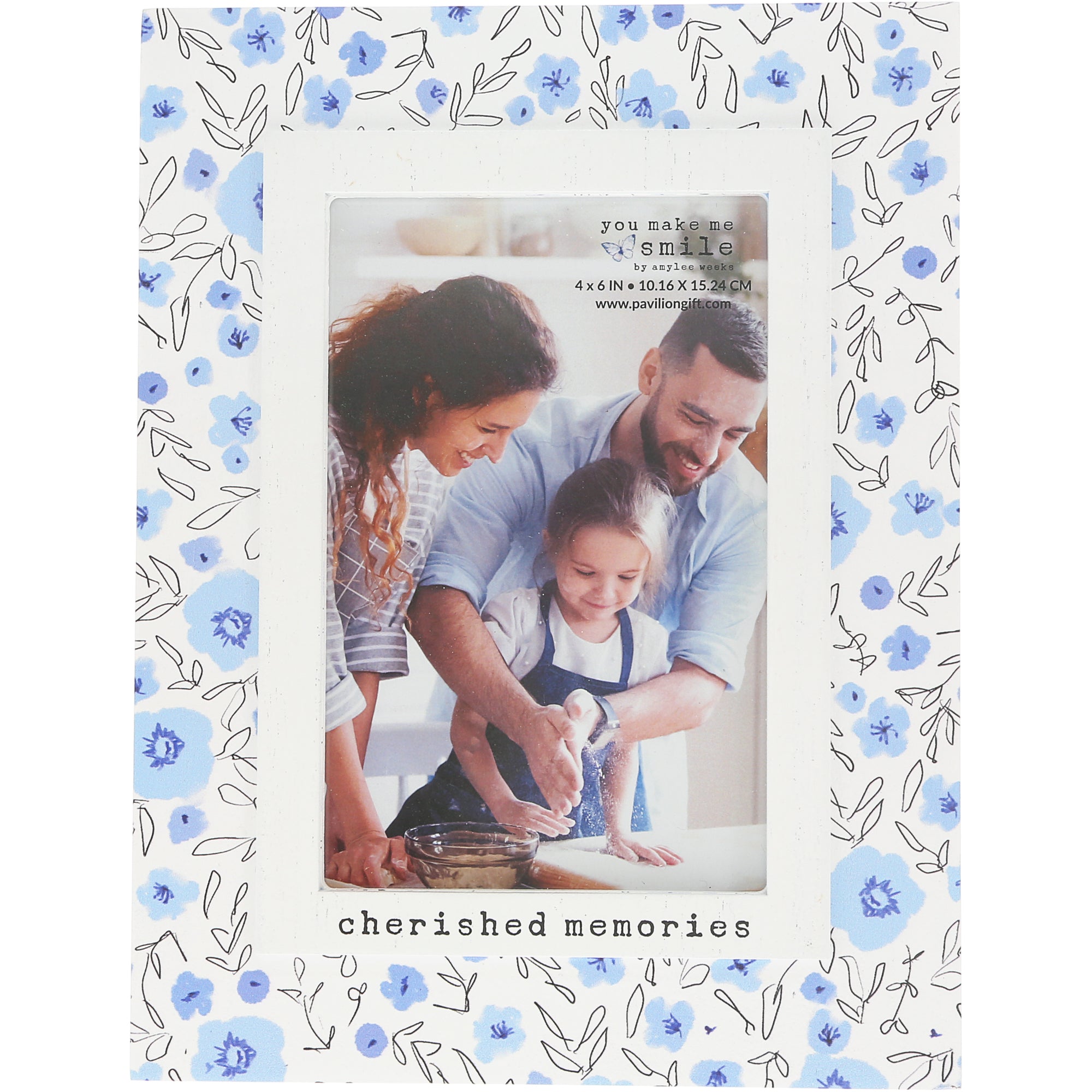 - IN-HOUSE DESIGN: "Cherished Memories" text and the accompanying blue floral pattern image are printed onto the front of the photo frame. The frame features a raised white wood trim around the photo rim. The backing is made from a thick cardboard-like material and four metal tabs for photo replacement.