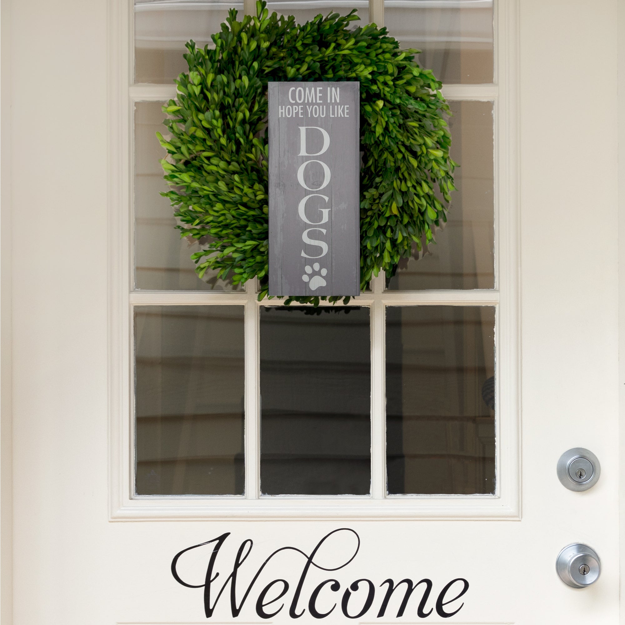 - IN-HOUSE DESIGN: The cool gray rustic-finished textured four-section boarded front has a glossy white "Come In Hope You Like Dogs" sentiment decal and a pawprint. The flat-backing has a natural pine finish.