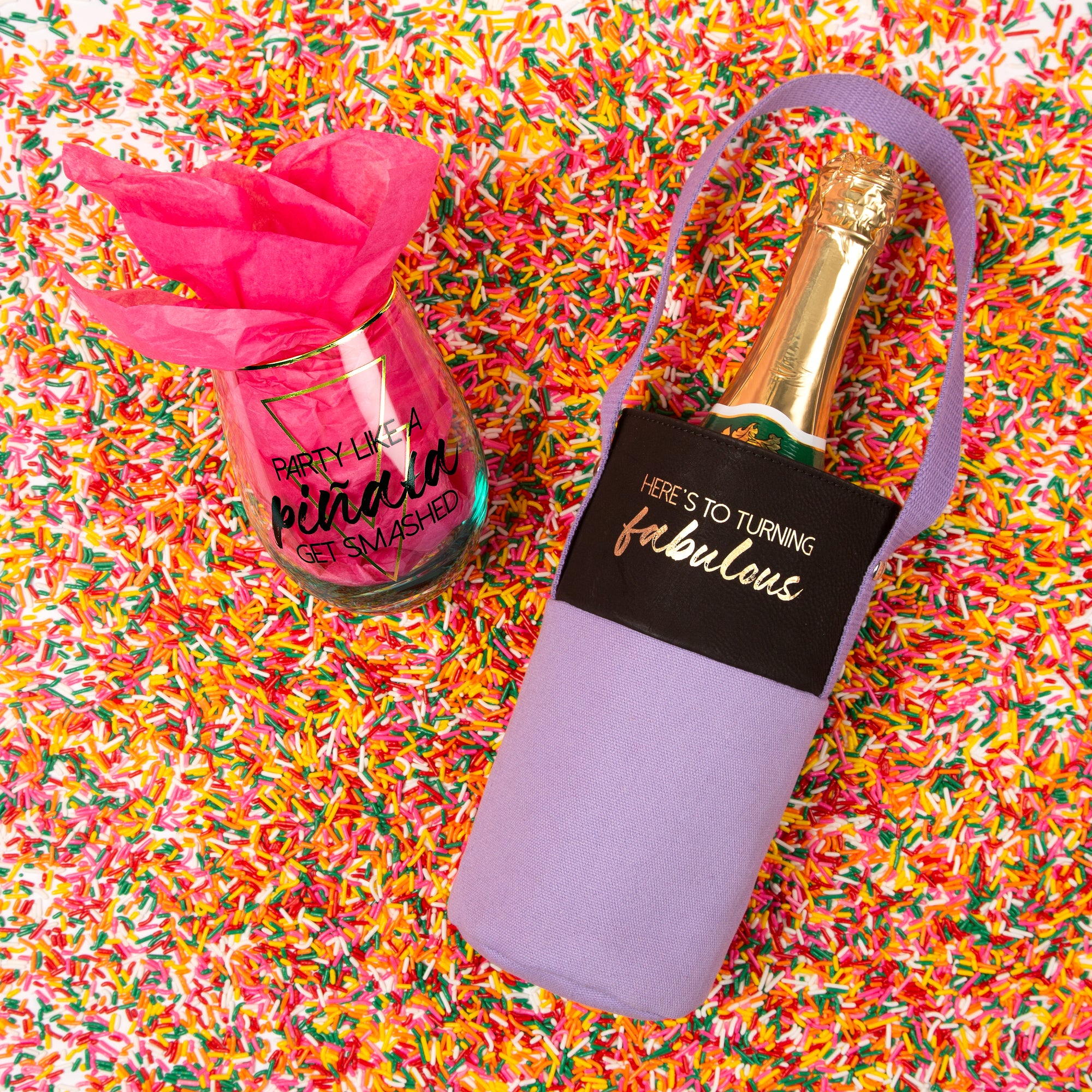 • IN-HOUSE DESIGN: "Party Like A Pinata Get Smashed" text decal is applied to the front of the glass, alongside a heat-stamped gold design and an ombre spray-painted base.