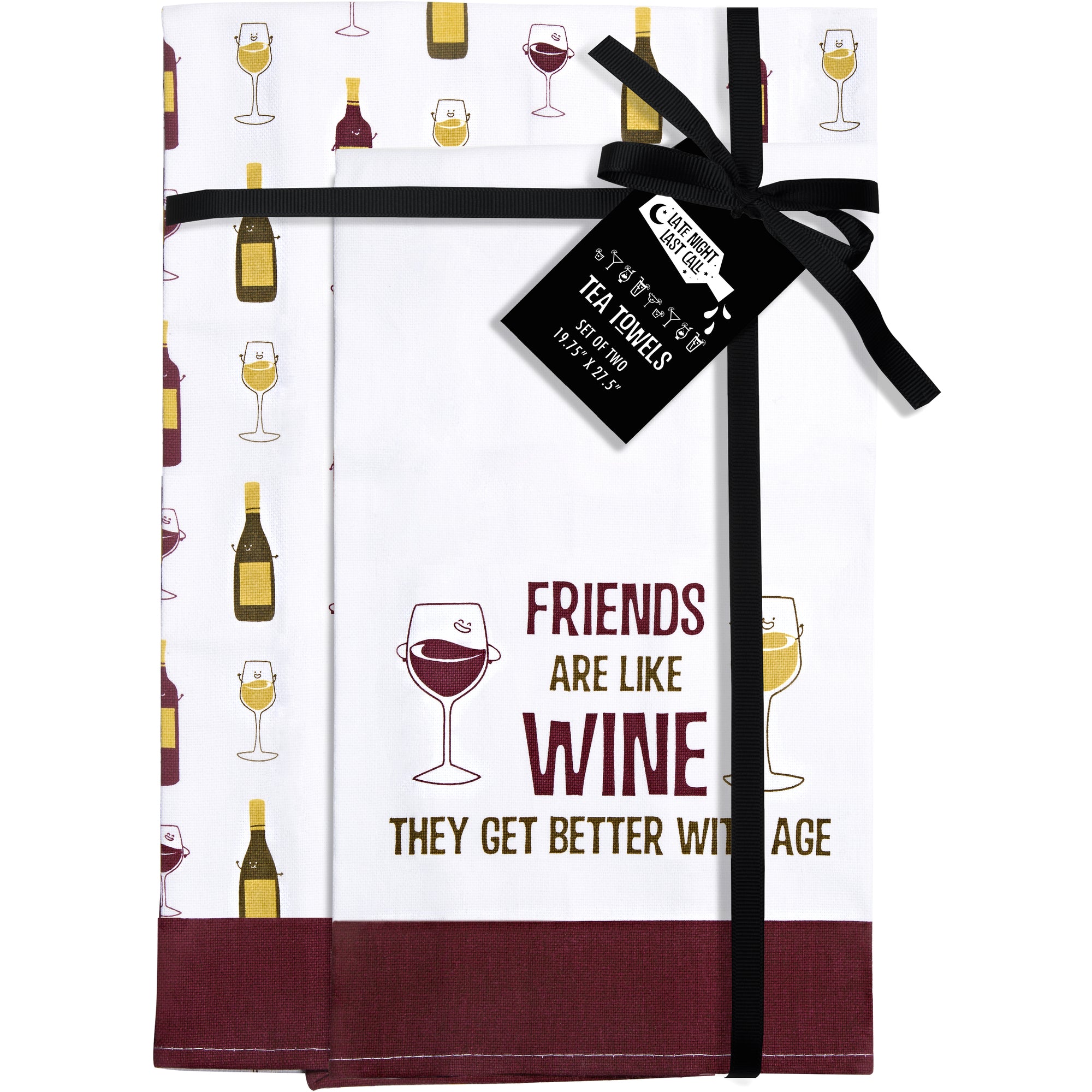 - IN-HOUSE DESIGN: "Friends Are Like Wine; They Get Better With Age" text is printed onto the front of one tea towel and a wine bottle and glass pattern is printed onto the other.
